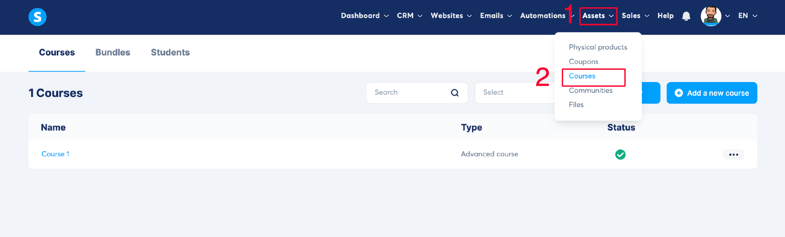 In the menu, click on the "Assets" tab (number 1 in the image) and then "Courses". (number 2 in the image)