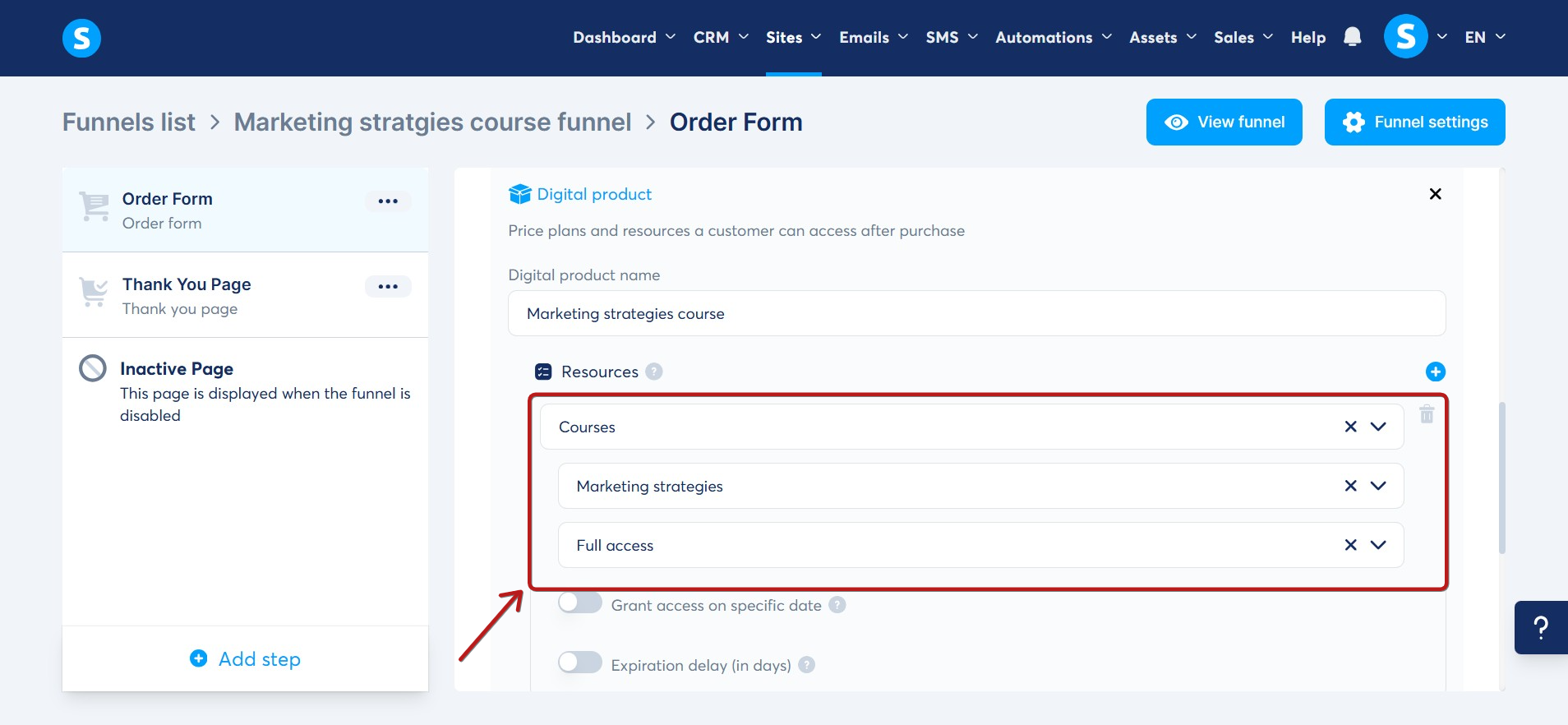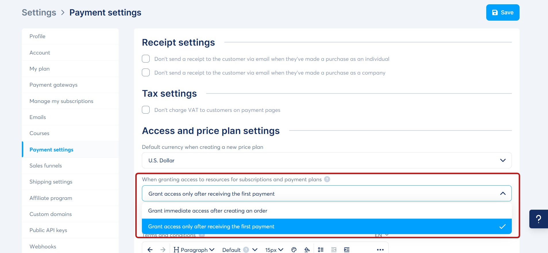 By default, this setting is set to Grant immediate access after creating an order. However, to avoid giving the customer access to the resource without receiving the first payment, select Give access only after receiving the first payment.