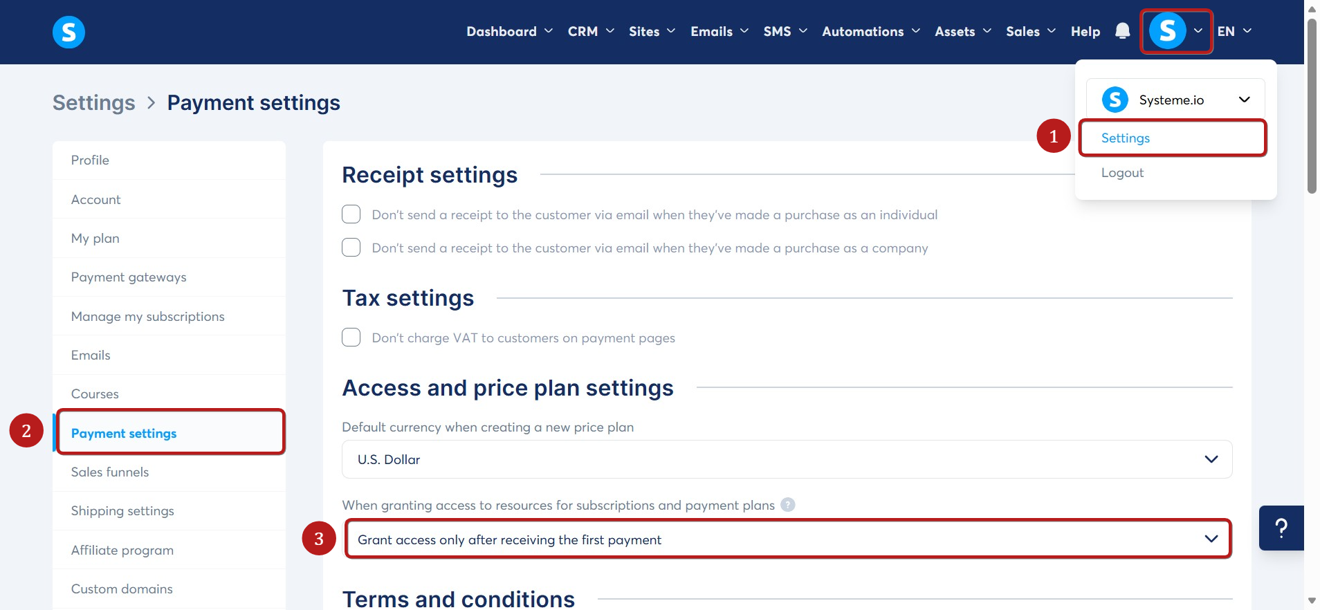 To do this on your systeme.io account, simply go to your Profile picture and click on Settings (1).