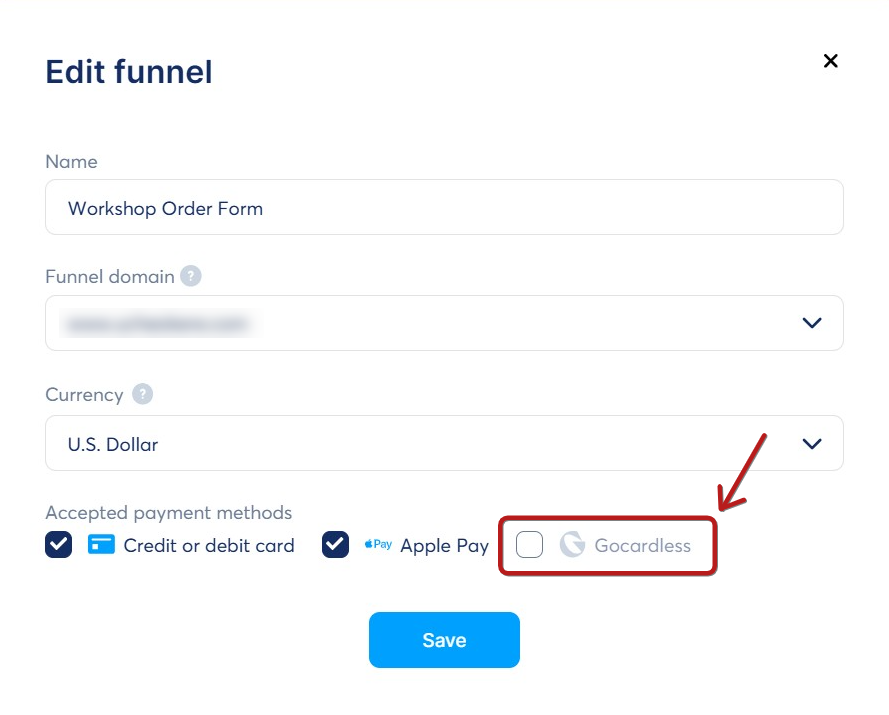 After filling in the forms, activate the GoCardless payment method in your sales funnel settings by clicking the GoCardless checkbox.