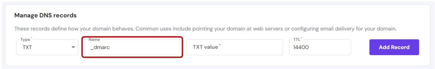 Depending on your provider, the domain name will automatically be added to the name, resulting in "_dmarc.yourdomain.com ".