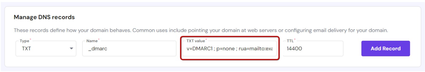 3. Enter the value of your record. Here's an example value for DMARC: