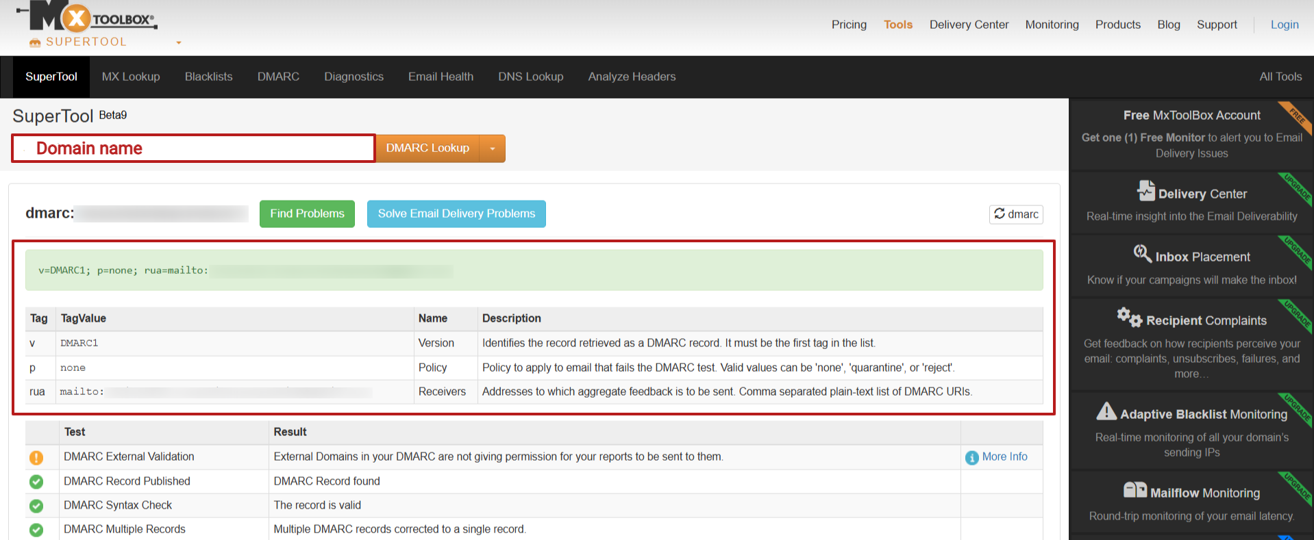 3. Once you have created the DMARC record, you can verify that it has been added correctly by visiting the website "https://mxtoolbox.com/dmarc.aspx". Enter your domain name and click "DMARC Lookup". The website will display a list of your DNS records, including your DMARC record: