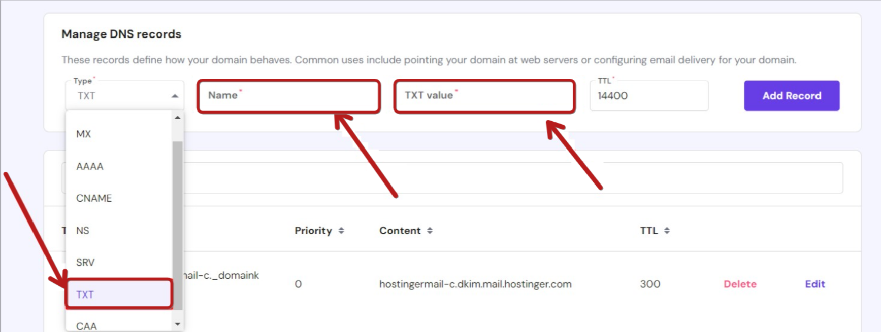 1. Create a TXT record. After starting the record creation process, enter a name and value for the record.
