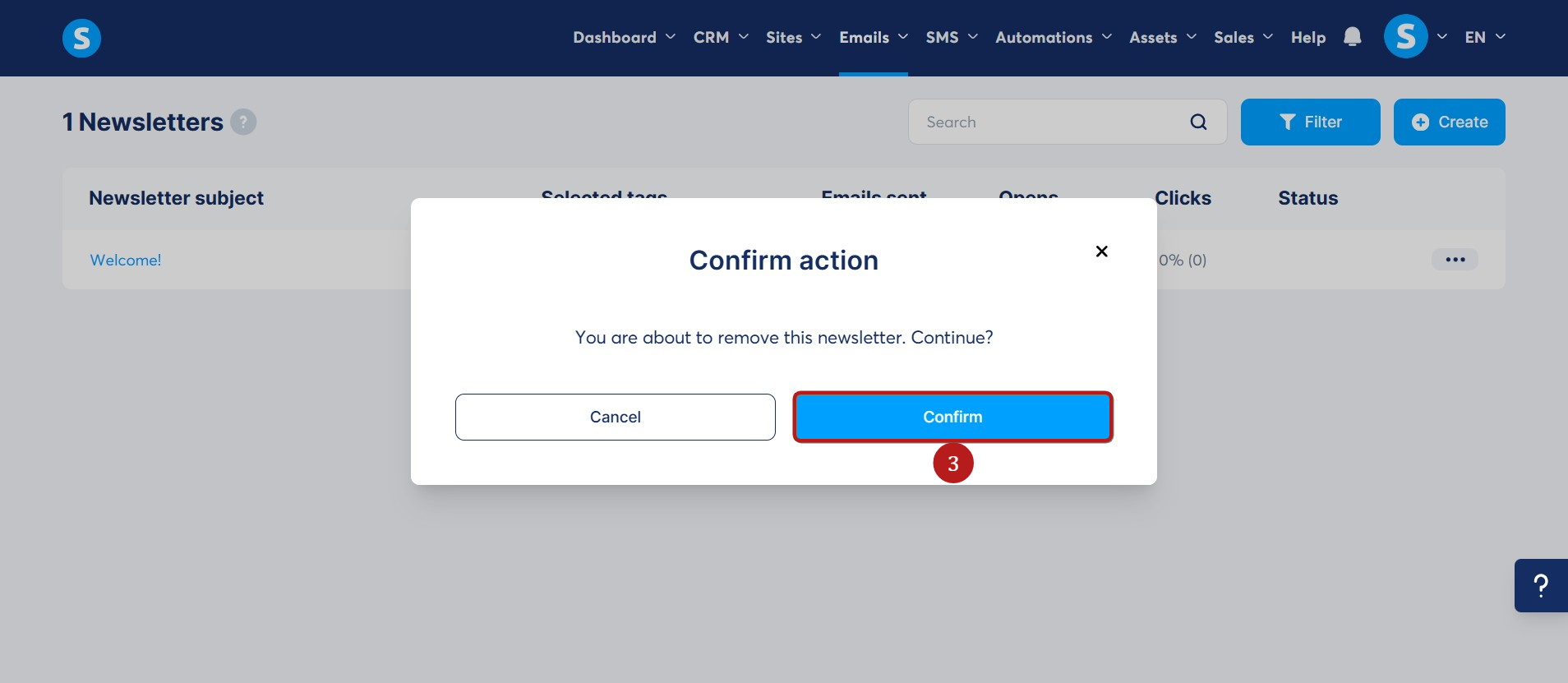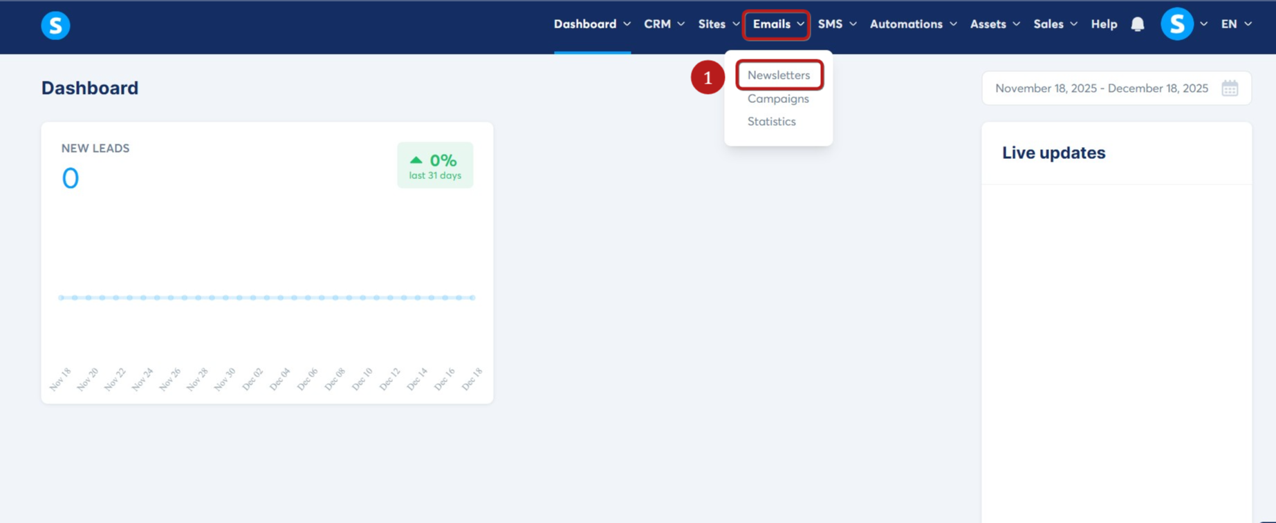 On the menu bar, click on Emails, and then on Newsletters (1).