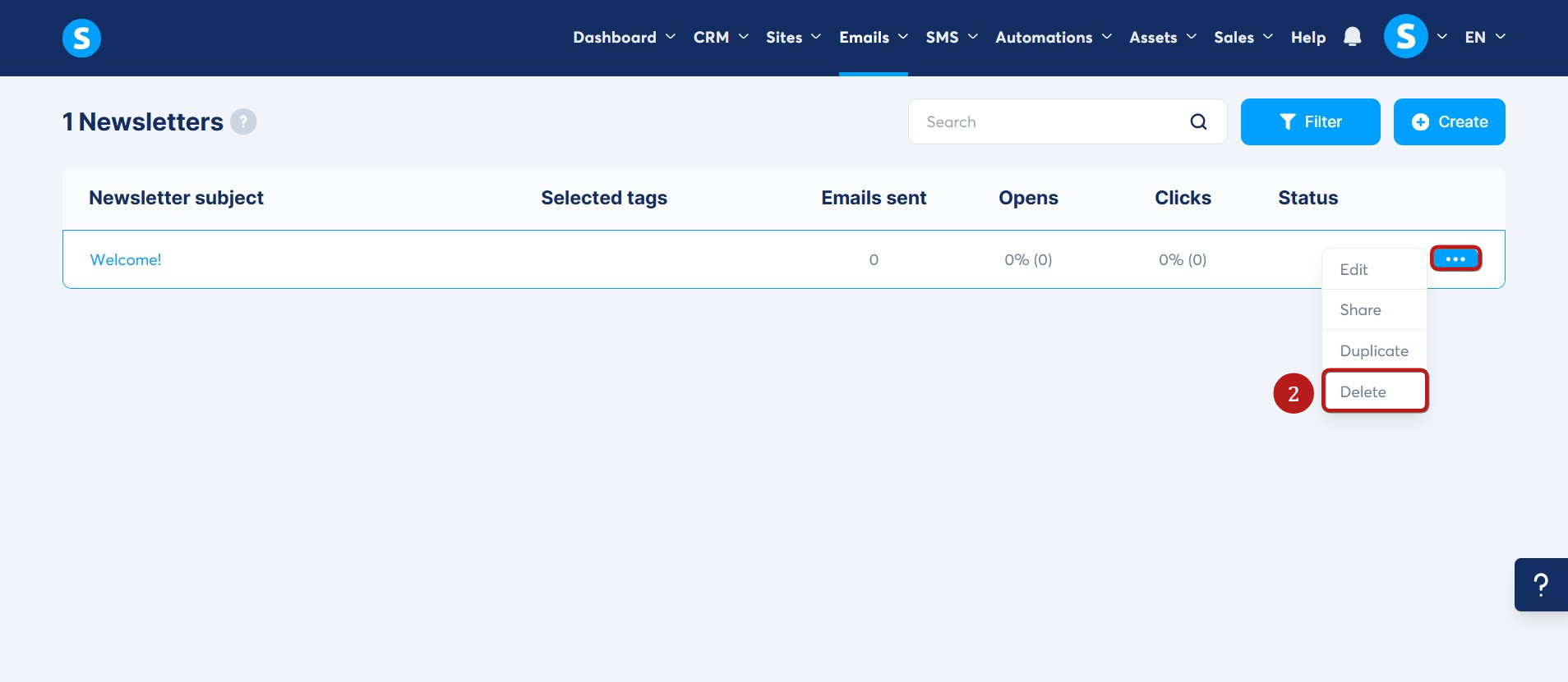 Locate the newsletter you want to delete, click on the three dots (...), and then on Delete (2).