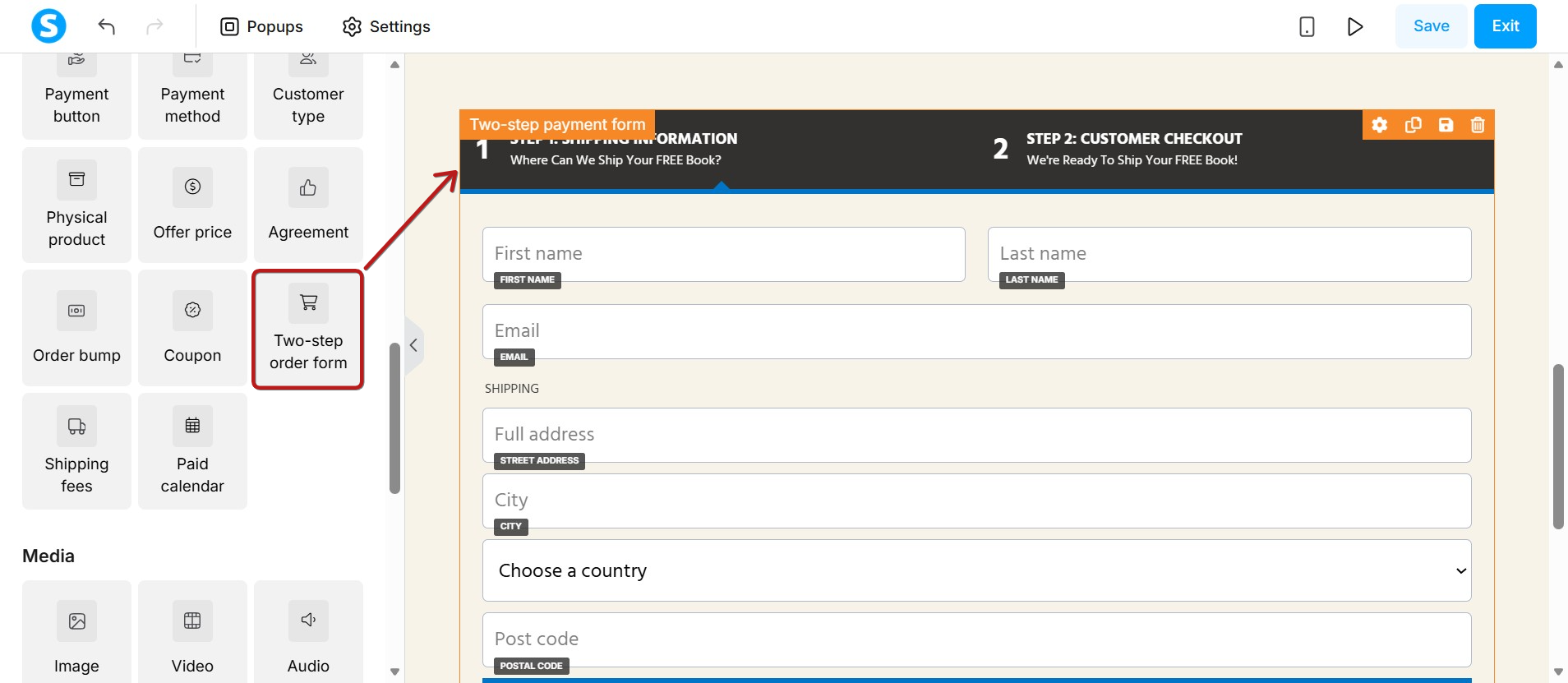 If you want to use a two-step order form on your order form page, drag the Two-step order form element onto your payment page :