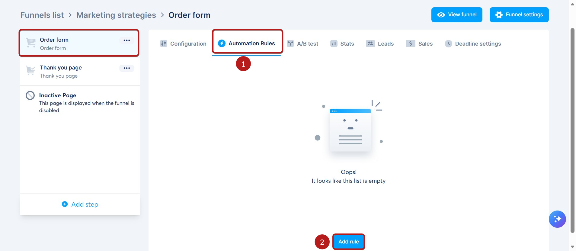 To do this, navigate to the Order Form page. Click on Automation rules (1), followed by Add rule (2).