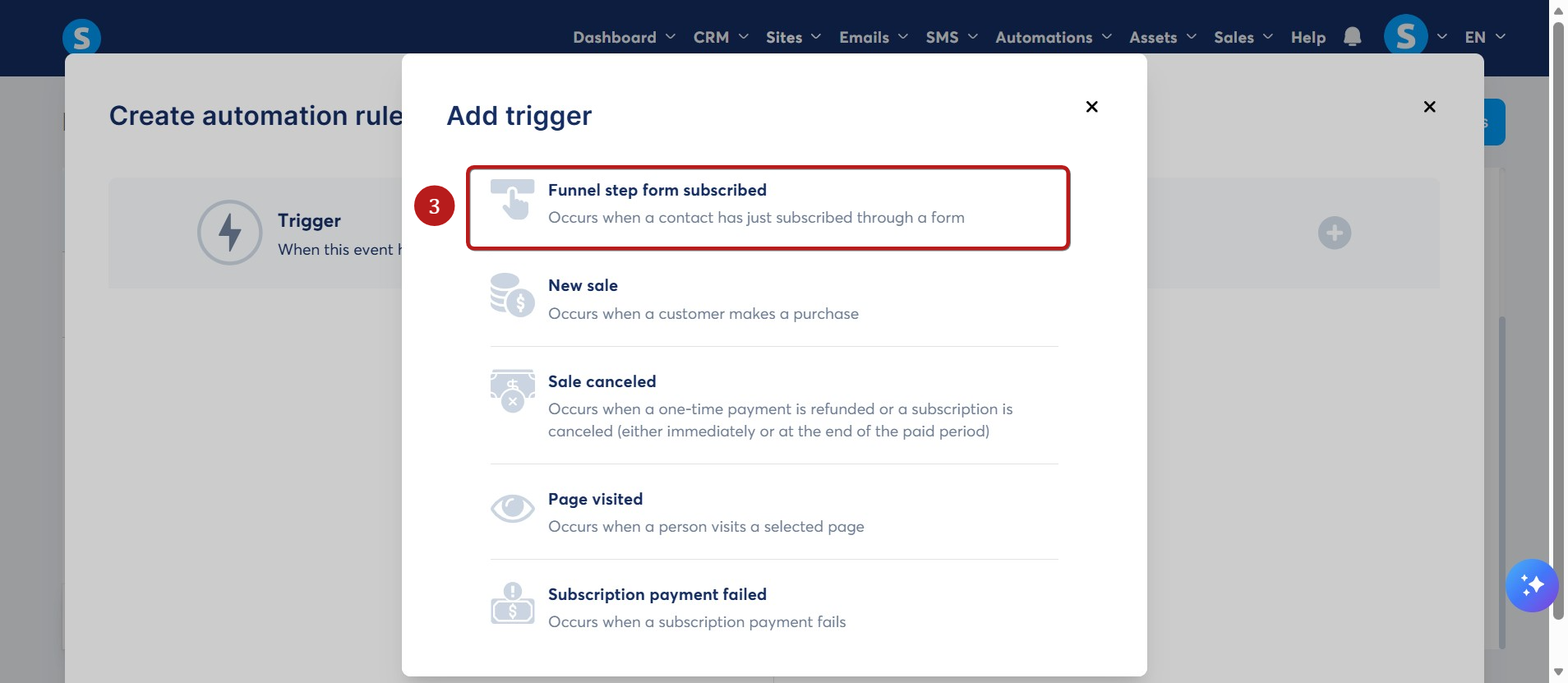 Select Funnel step form subscribed from the trigger list (3). Finally, choose your desired action.