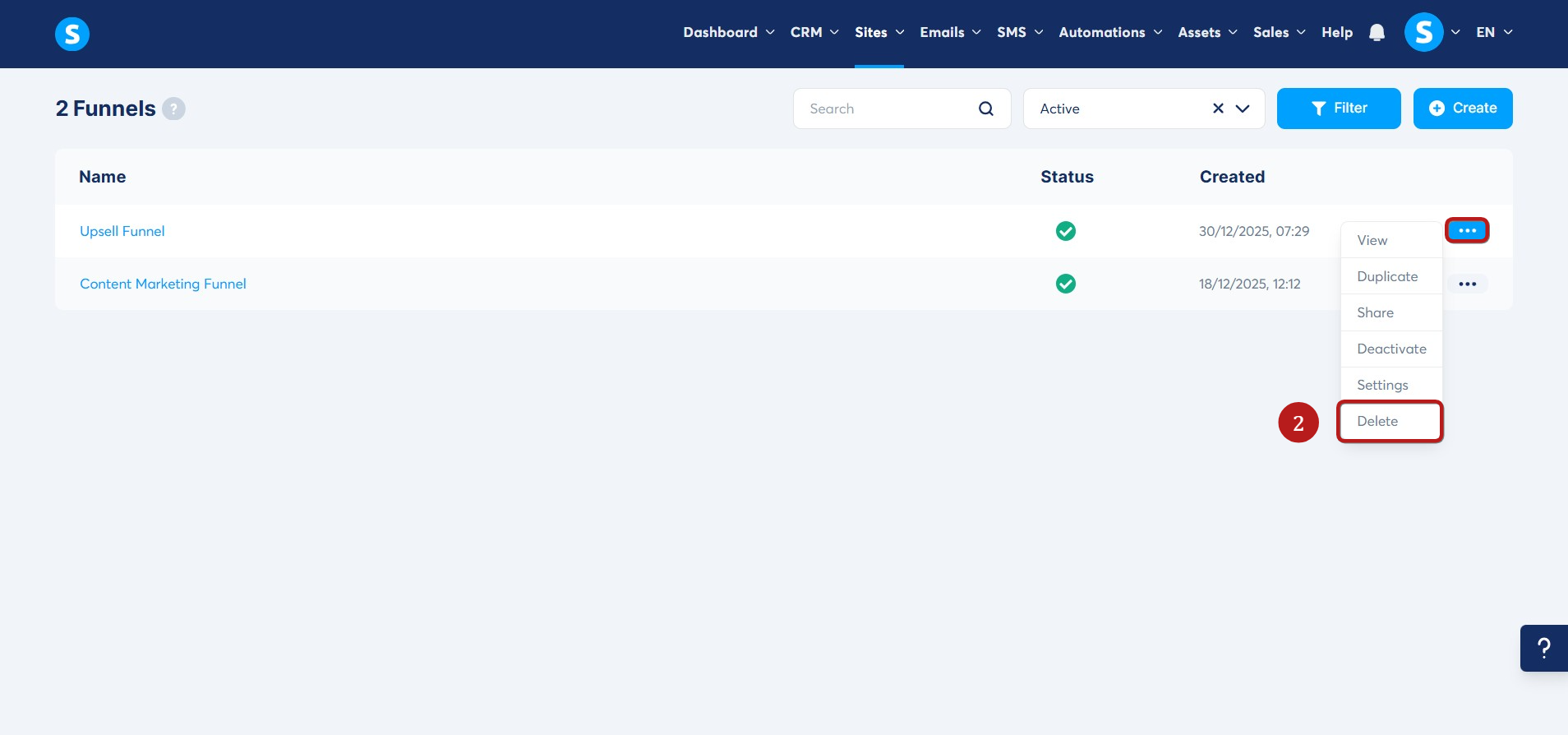 Locate the funnel you want to delete. Click the three dots icon (...), then select Delete (2).