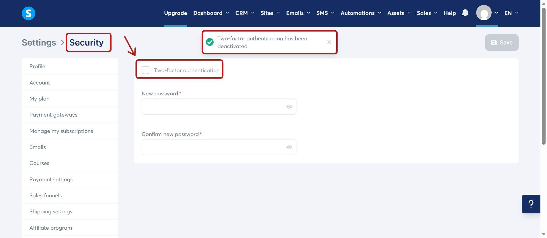 By default, two-factor authentication is enabled for all systeme.io users.