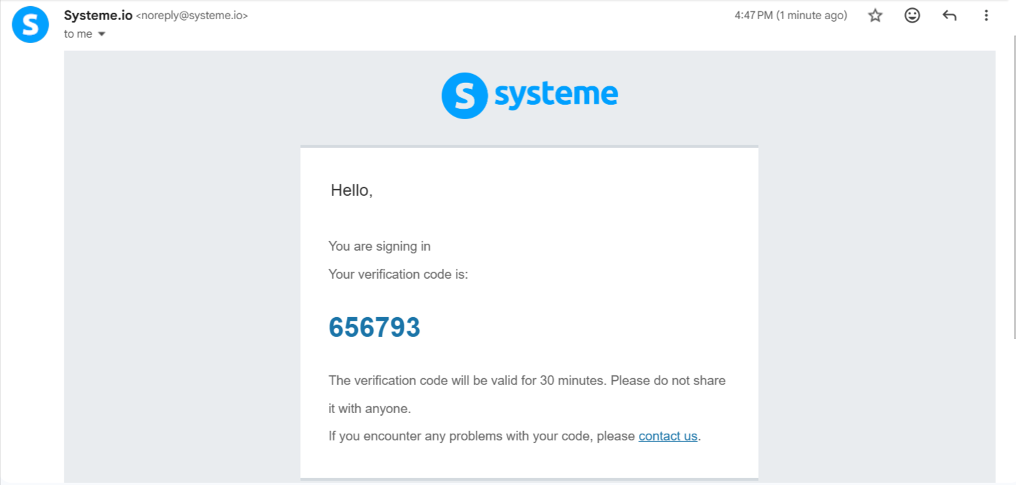 This method requires a second form of identification, which is a code sent to your email address when you try to log in to your systeme.io account.