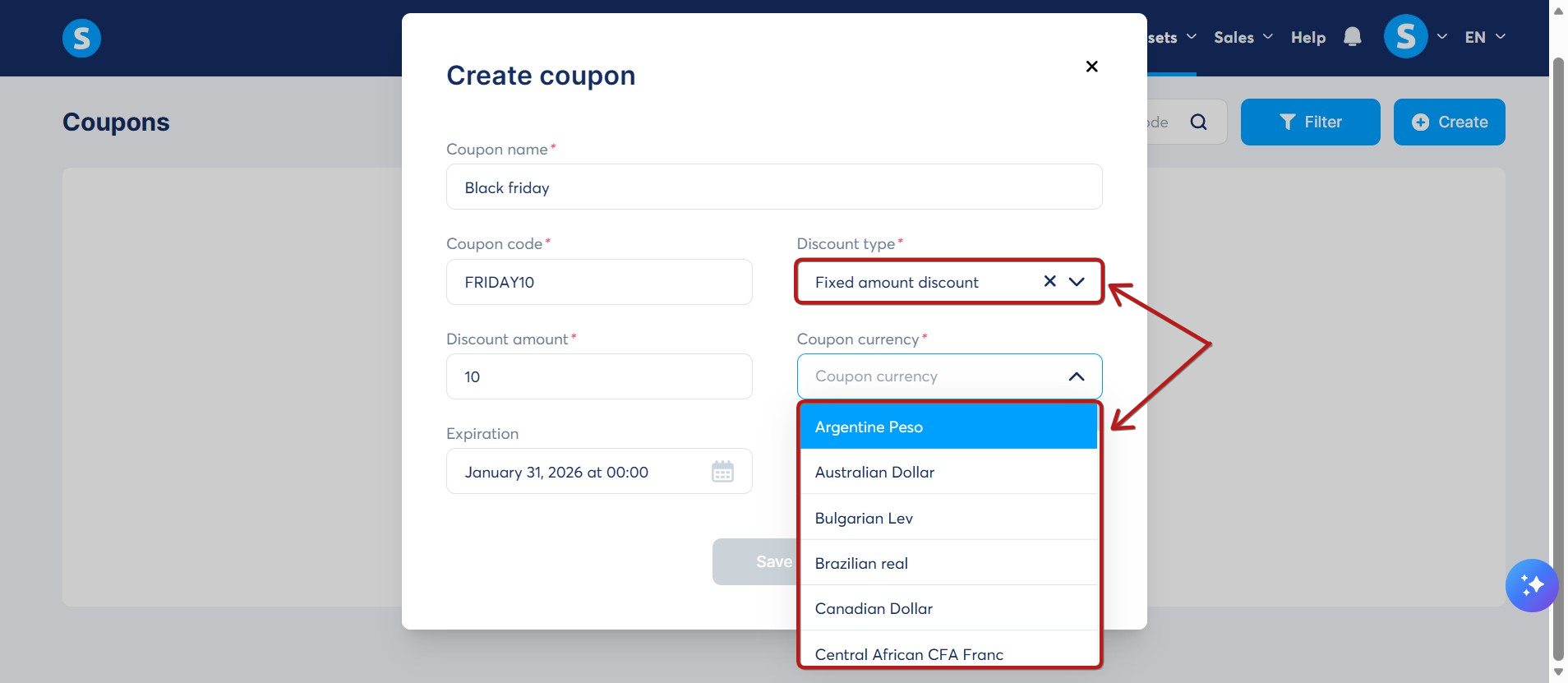 - By choosing the Fixed amount discount type, a new Coupon currency field will appear, where you must select the currency of the amount for which you wish to offer a discount.