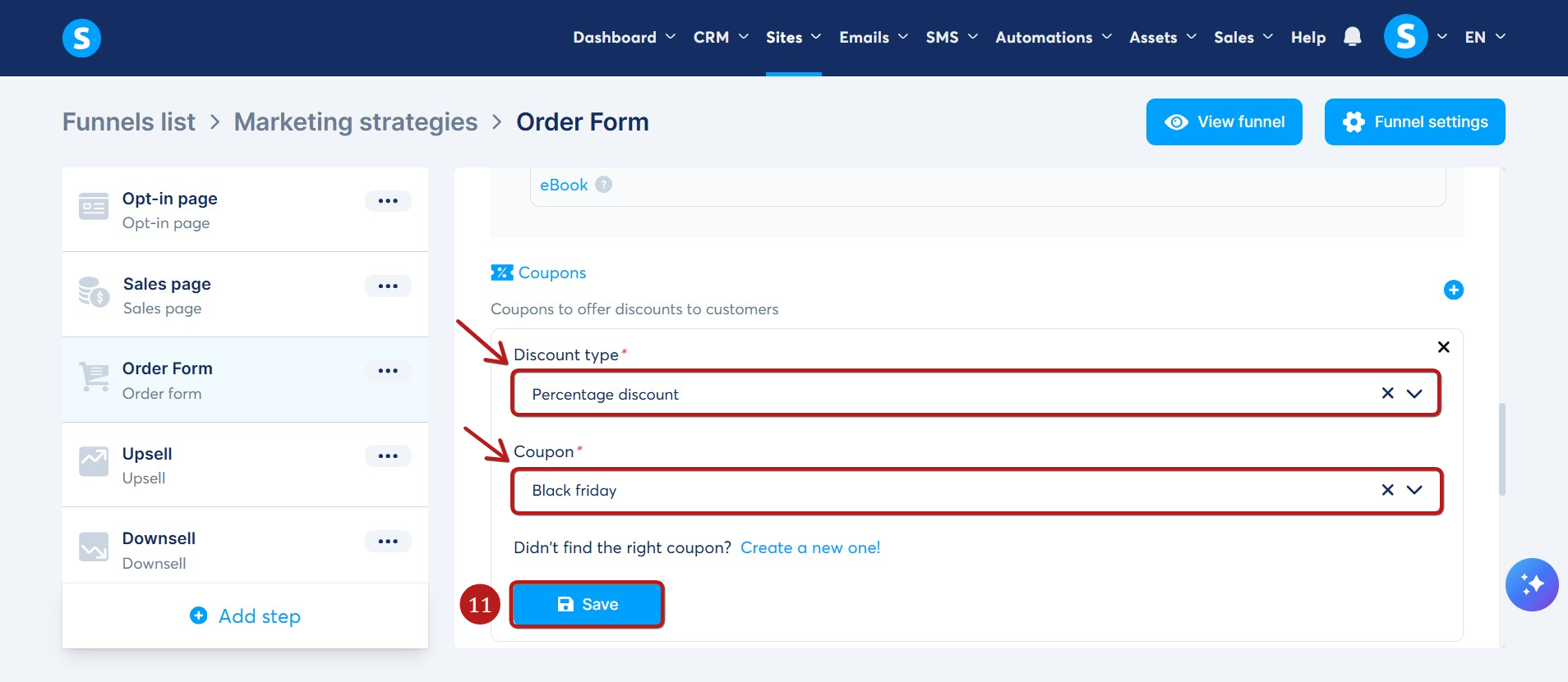 Select the discount type and choose a coupon code. Click Save (11).