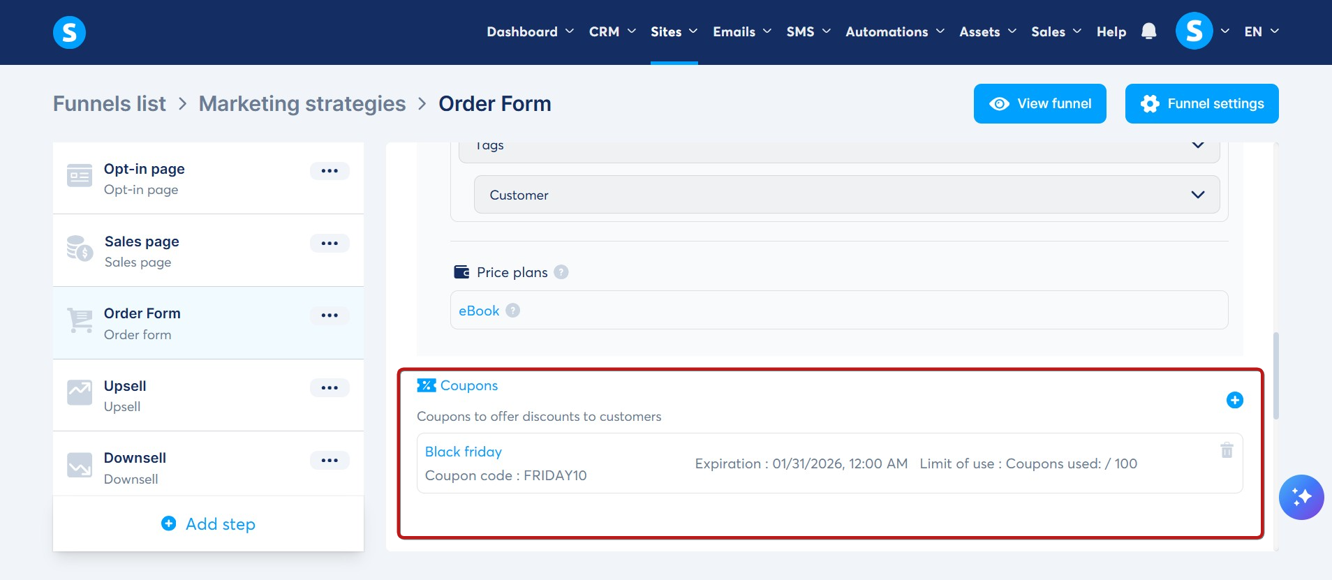 2. Inserting the coupon into the sales funnel: