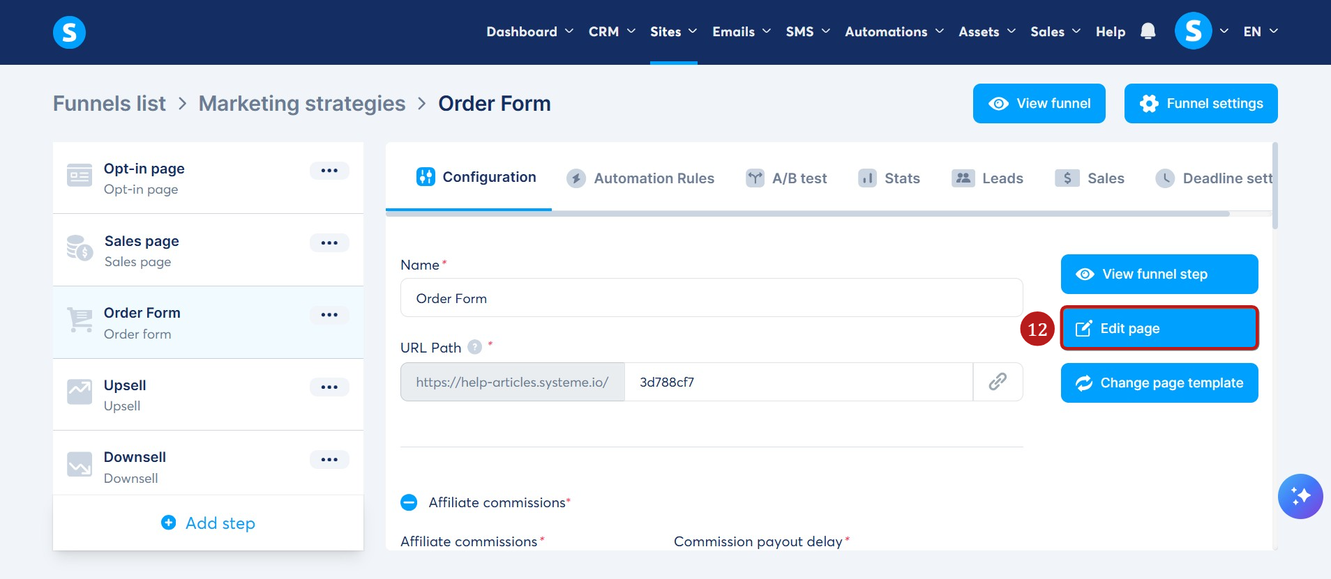 After creating your funnel and payment page, click on the order form.