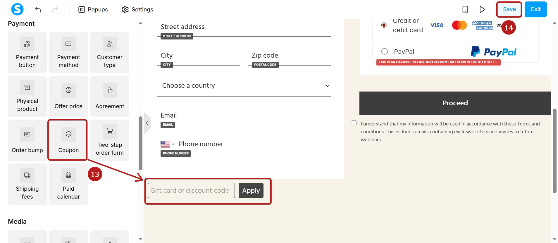 Drag the Coupon element (13) onto your page. Click Save (14) to apply your changes.
