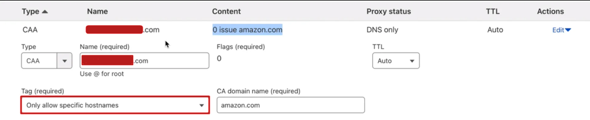 - To add an "issue" record, set the Tag to Only allow specific hostnames.