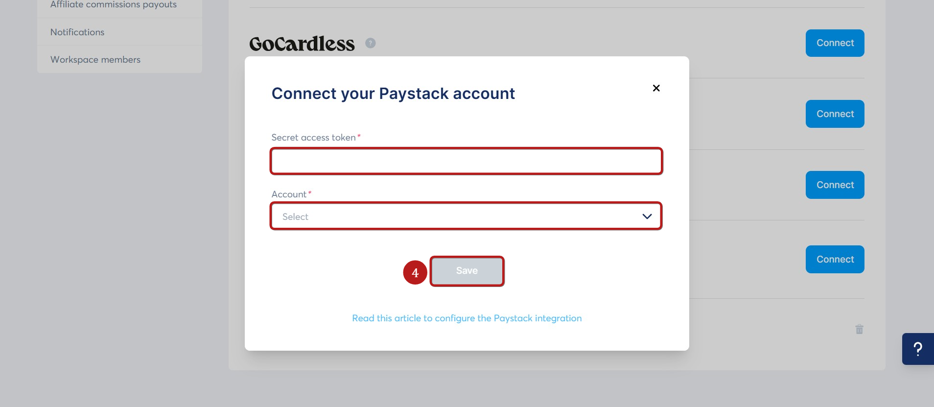 Enter the secret access token you copied from Paystack, making sure to select the subaccount you created from the drop-down menu, then click Save (4) to complete the integration.