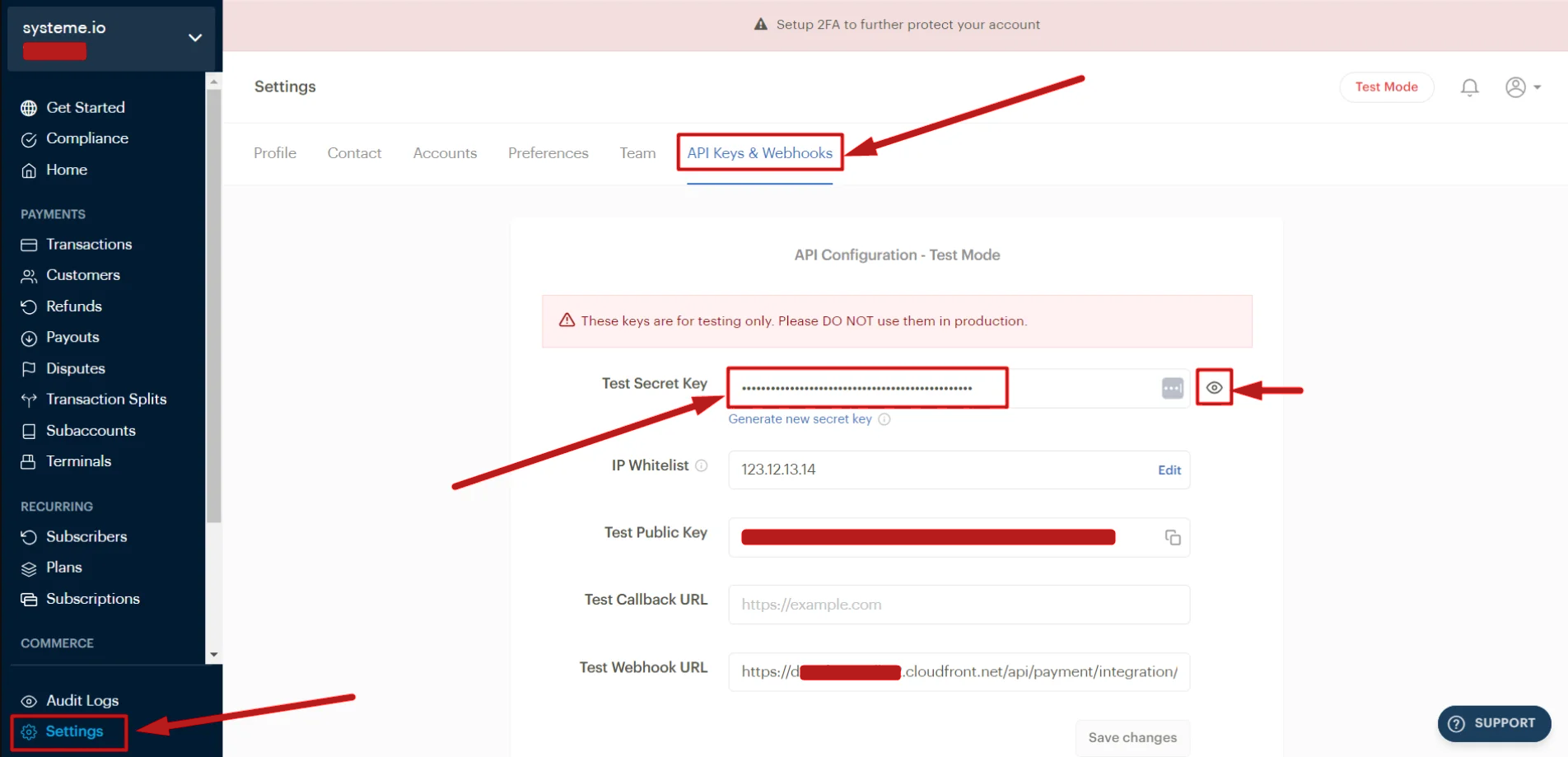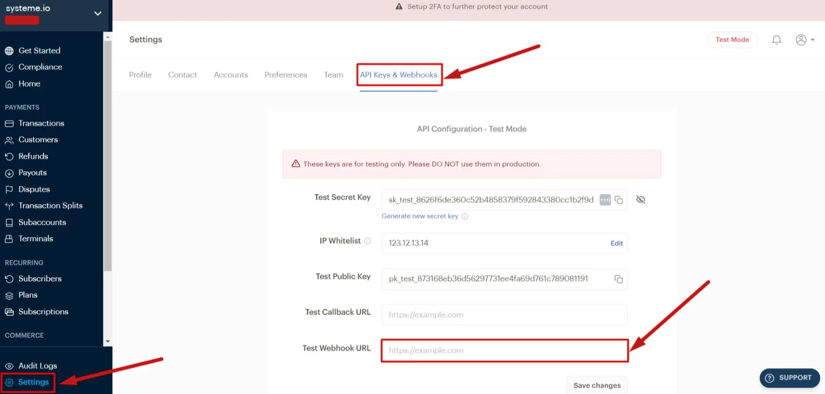 Copy the webhook URL generated on systeme.io, then return to the Paystack dashboard, go to Settings on the left-hand side panel, and paste the webhook URL into the Webhook URL entry in the API Keys & Webhooks section.
