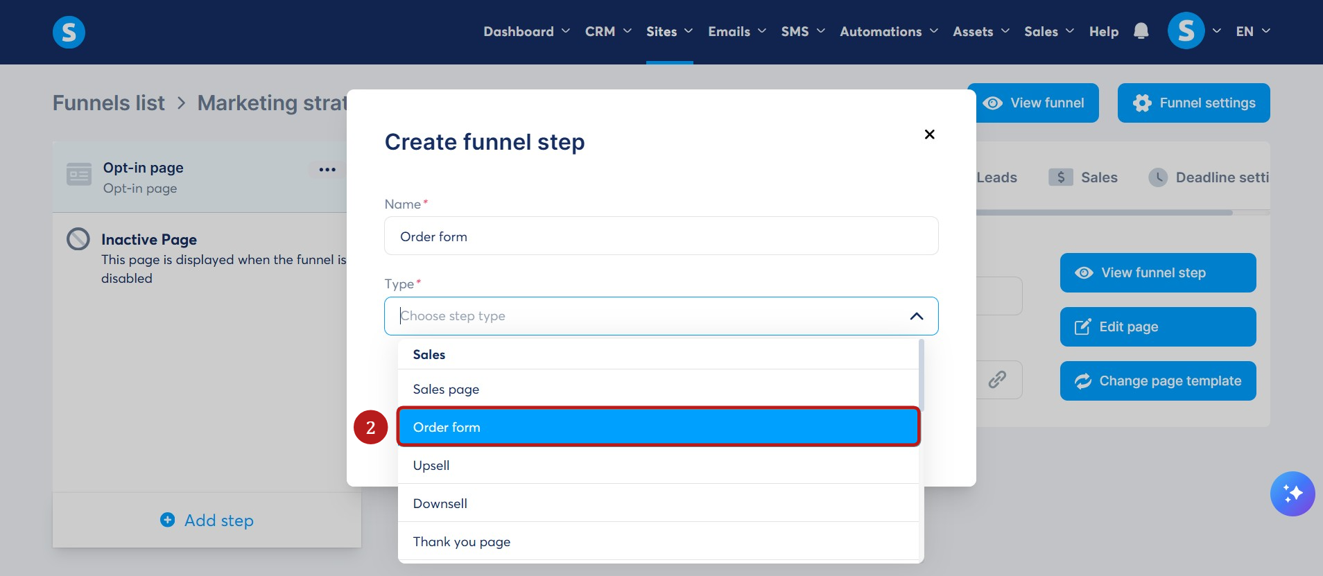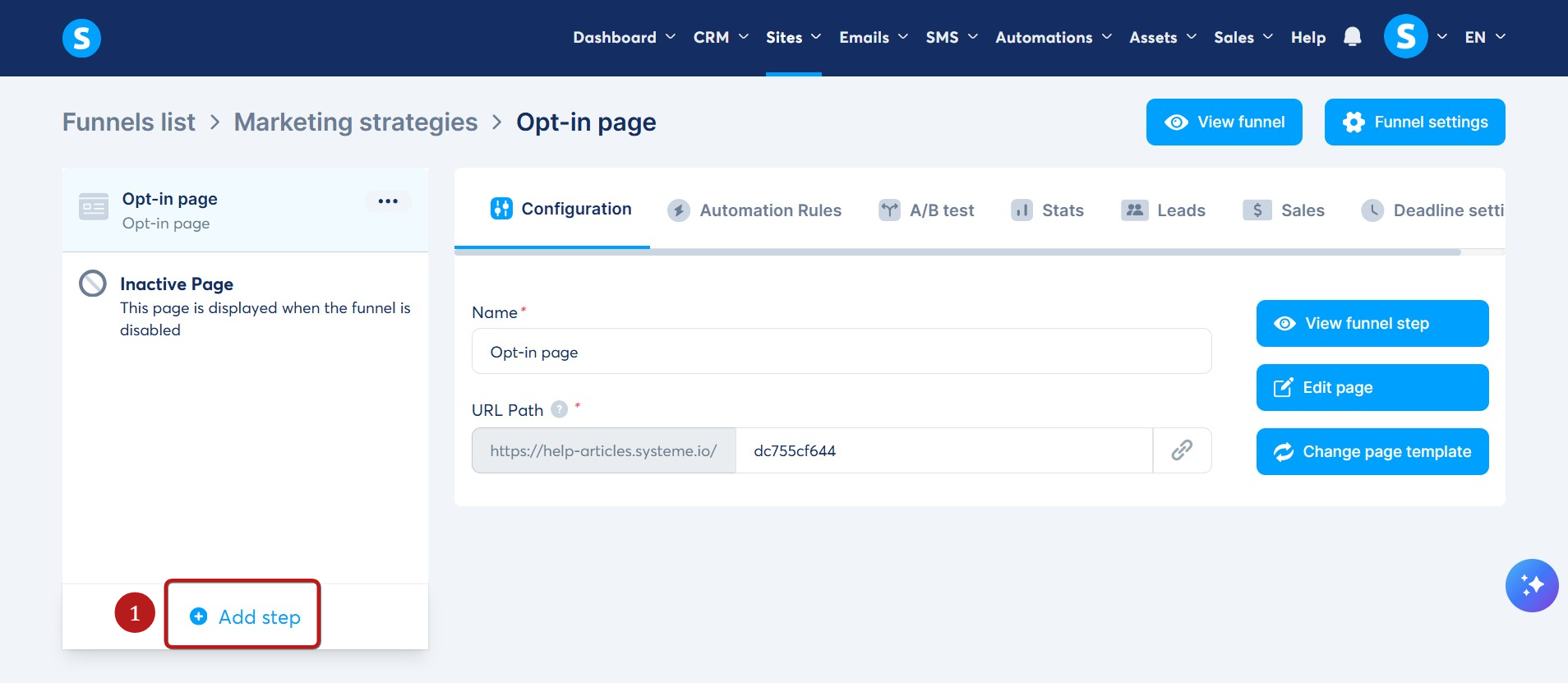 Go to the sales funnel where you want to add a payment page, then click on Add step (1) in the funnel pages menu on the left.