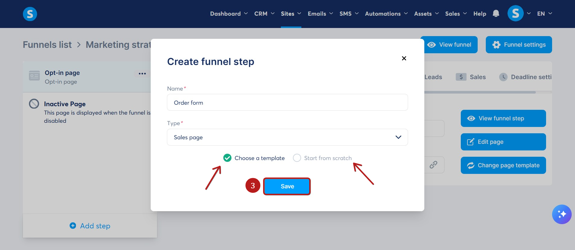 Choose a template or start from scratch, then click Save (3) to create your page.