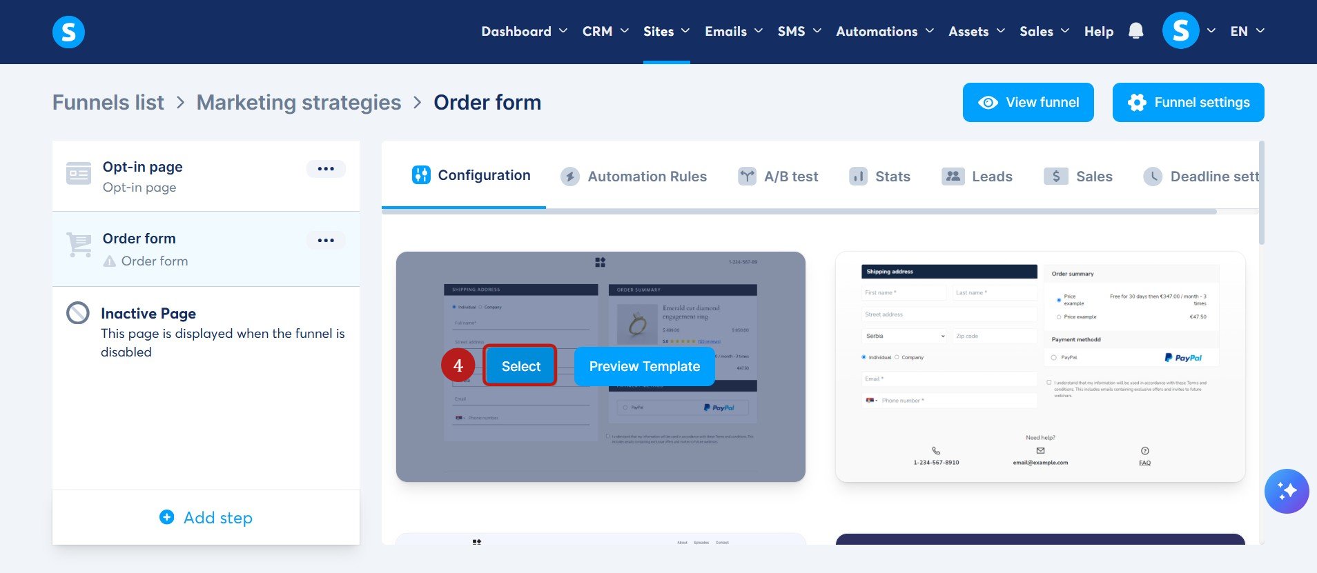 Browse the template library and click Select (4) on the template you want to use for the order page.