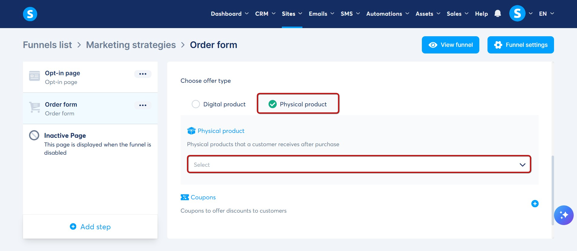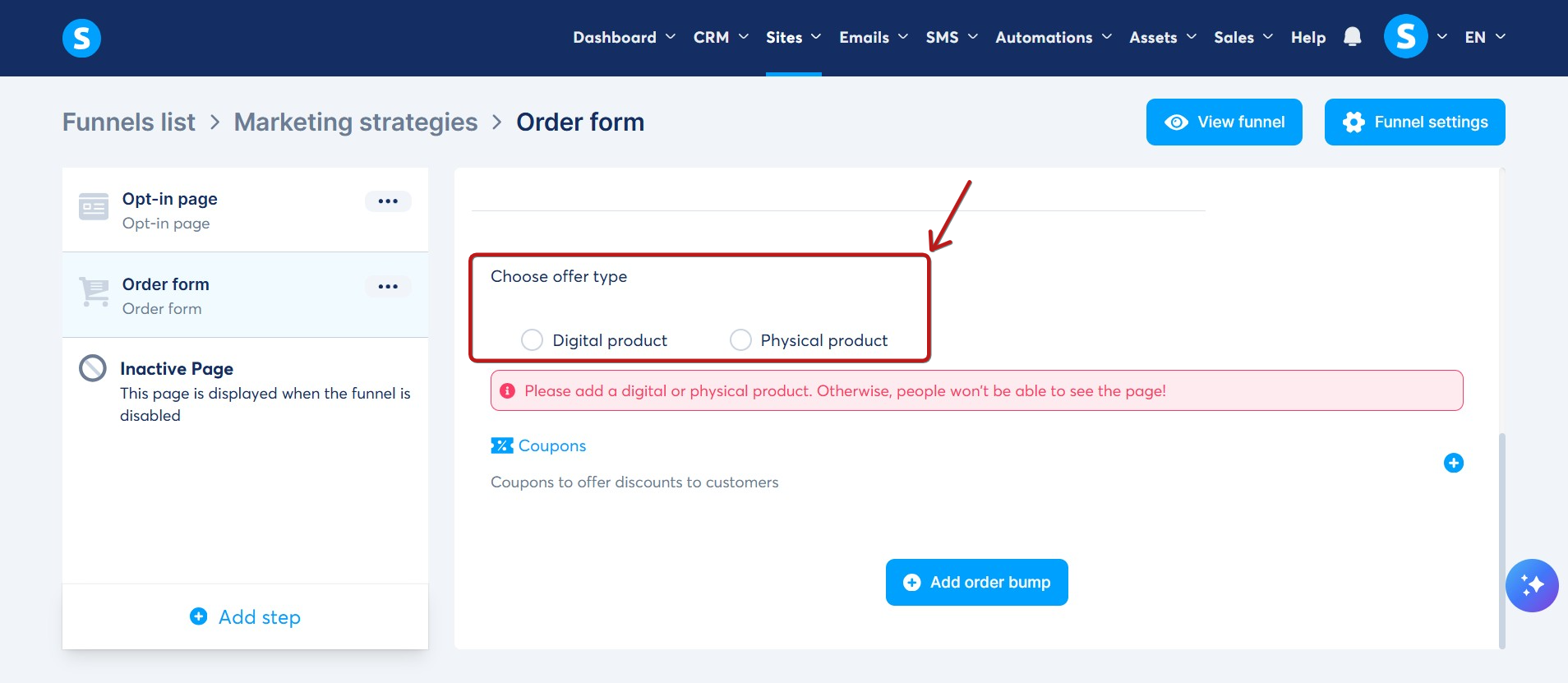 When creating an order form, you must to specify whether you are selling a digital product or a physical product.