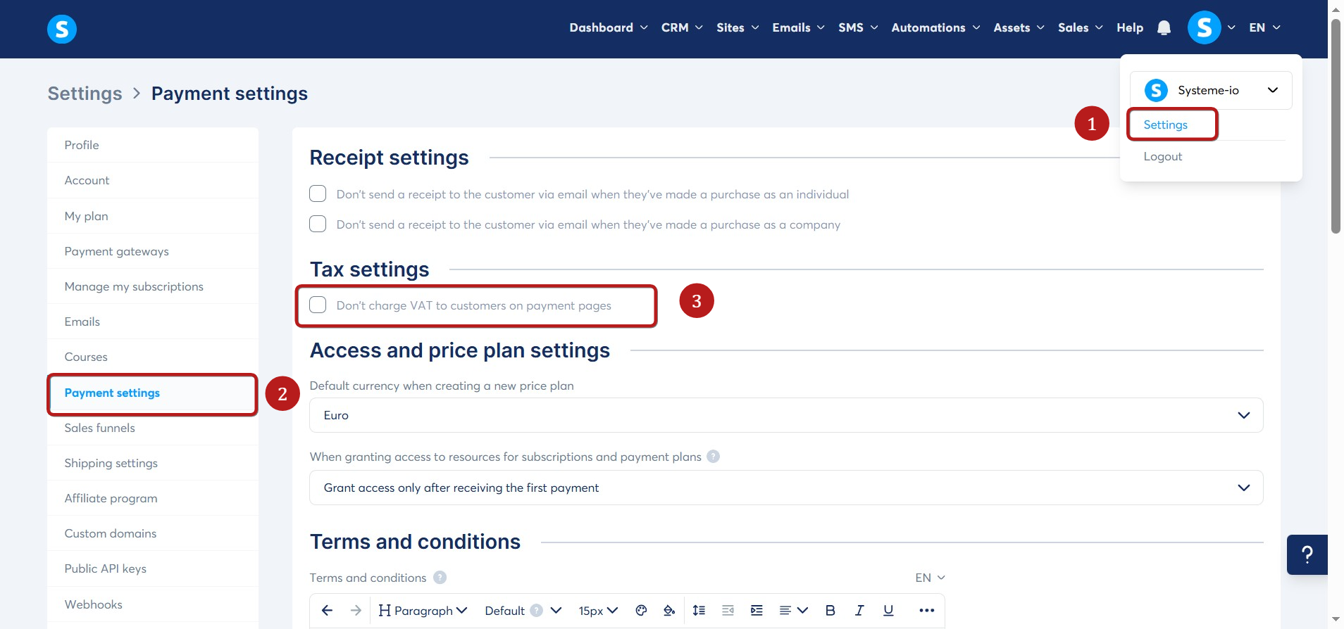 - Uncheck the box Don't charge VAT to customers on payment pages (3).