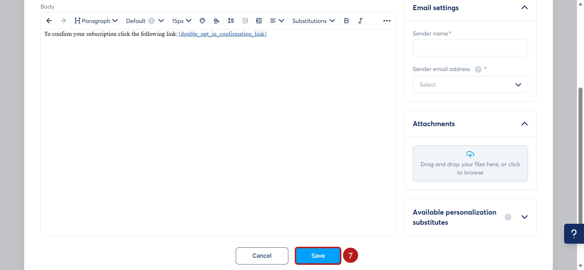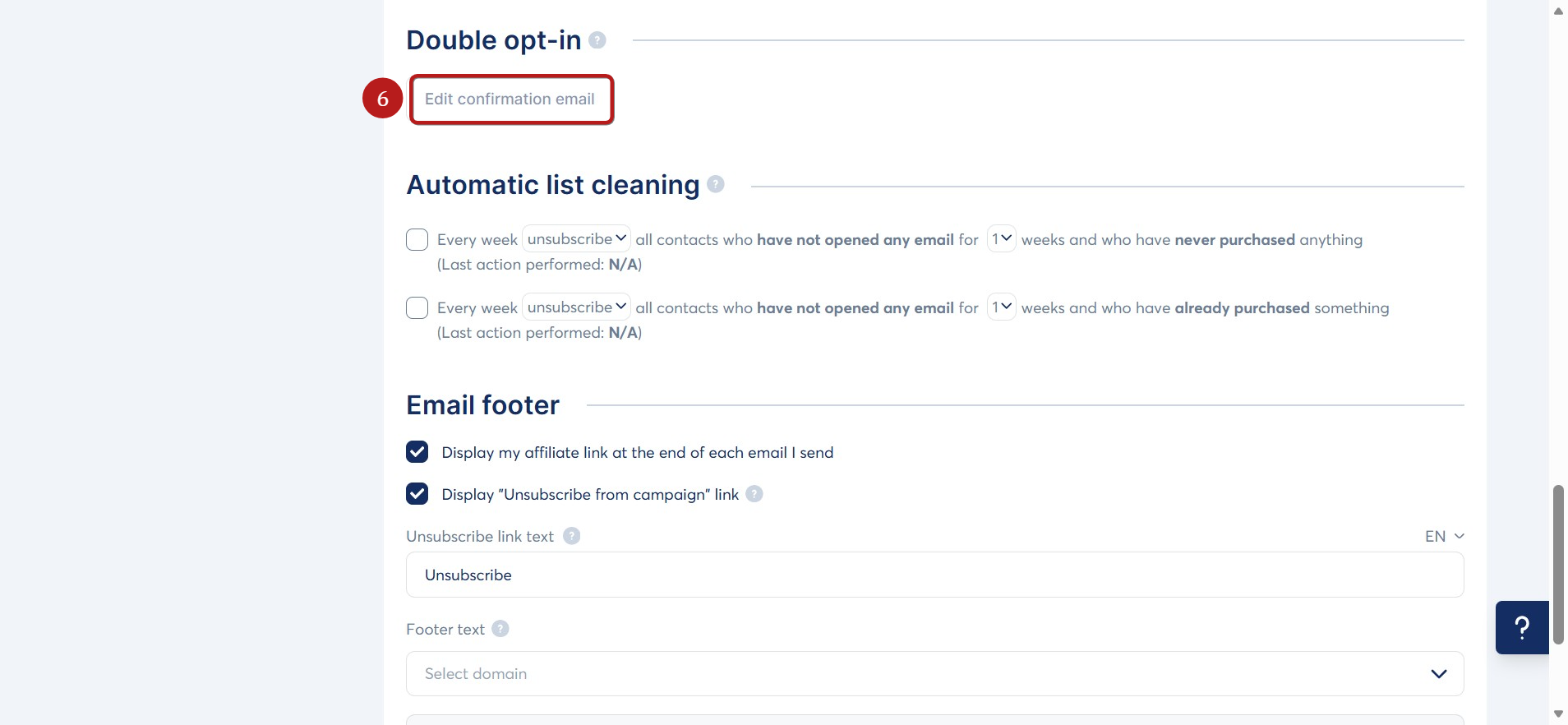 Scroll down to the 'Double opt-in' section and click Edit confirmation email to customize the content (6).