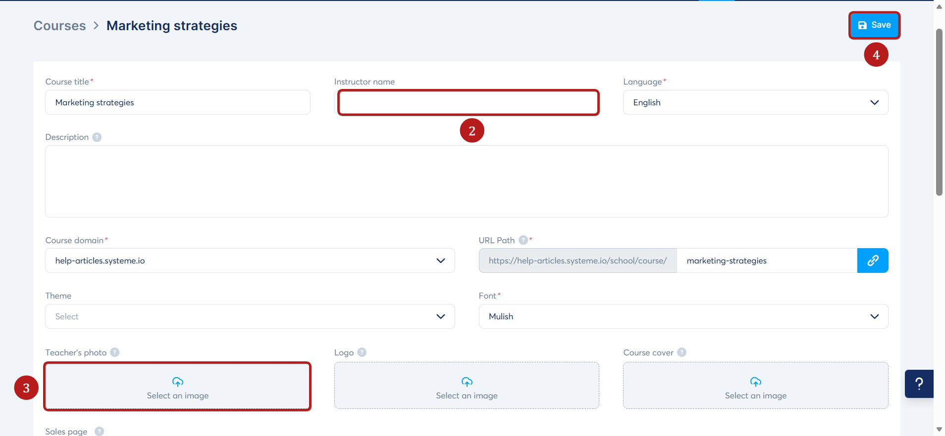 Update the instructor's name (2) and photo (3) for the course, then click Save (4) to confirm your changes.