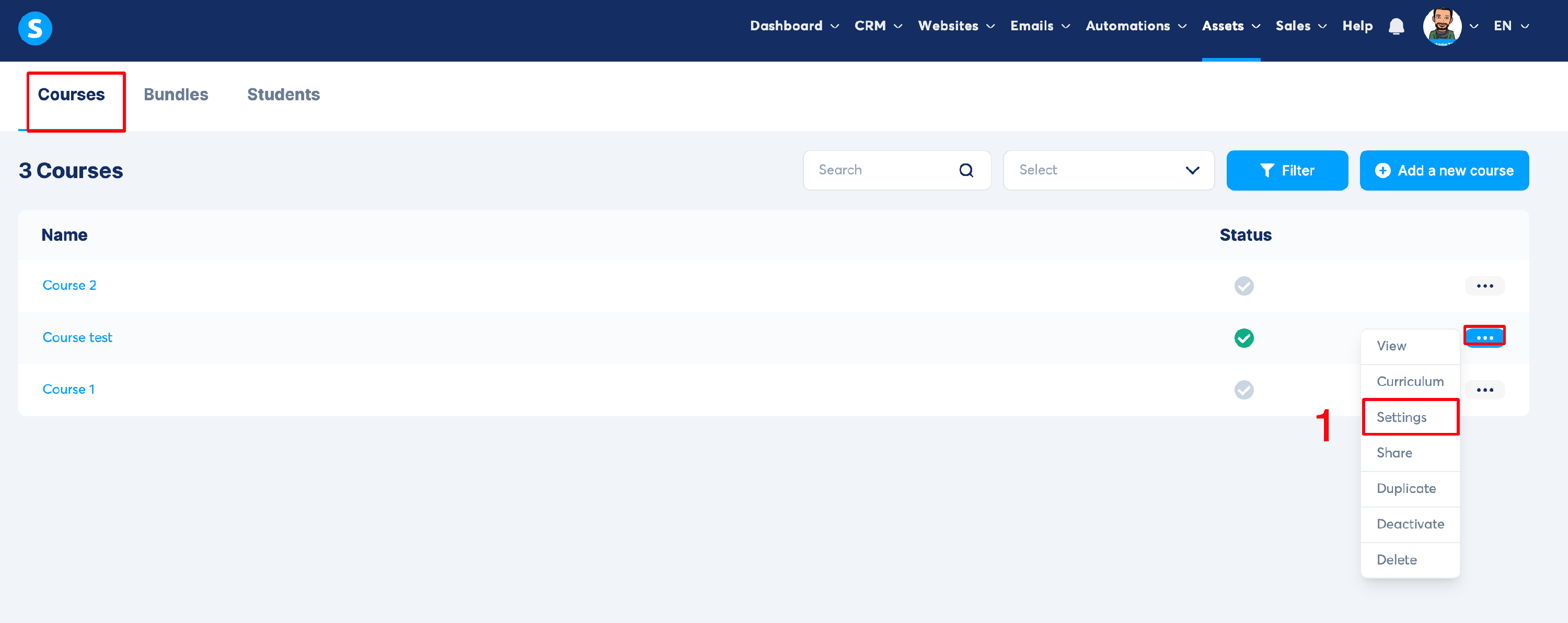 To modify information such as the name or photo of the instructor for each course, click on the 3 dots to display the course settings and click "Settings" (number 1 in the image).