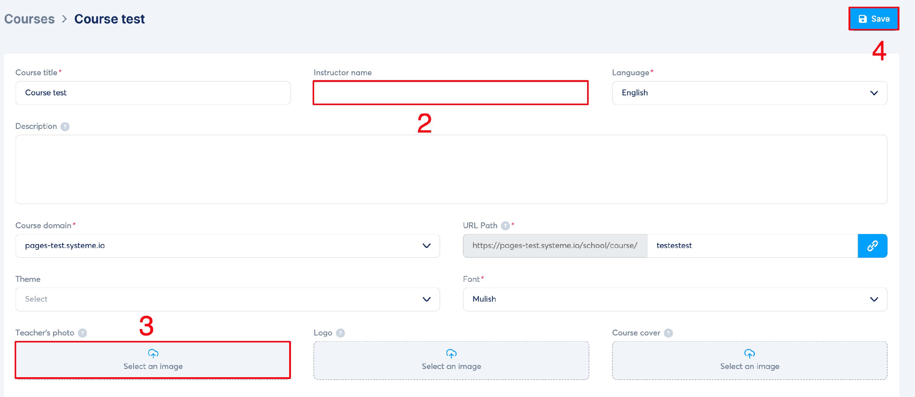 Change the name and photo of the instructor to display for this course (numbers 2 and 3 in the image) and click on "Save" to confirm your changes (number 4 in the image).