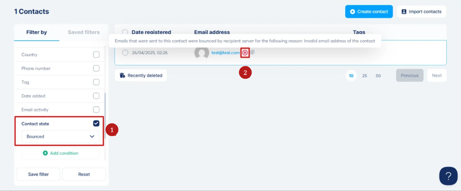You can also search for bounced contacts in your list by using the Contact Status (1) filter.