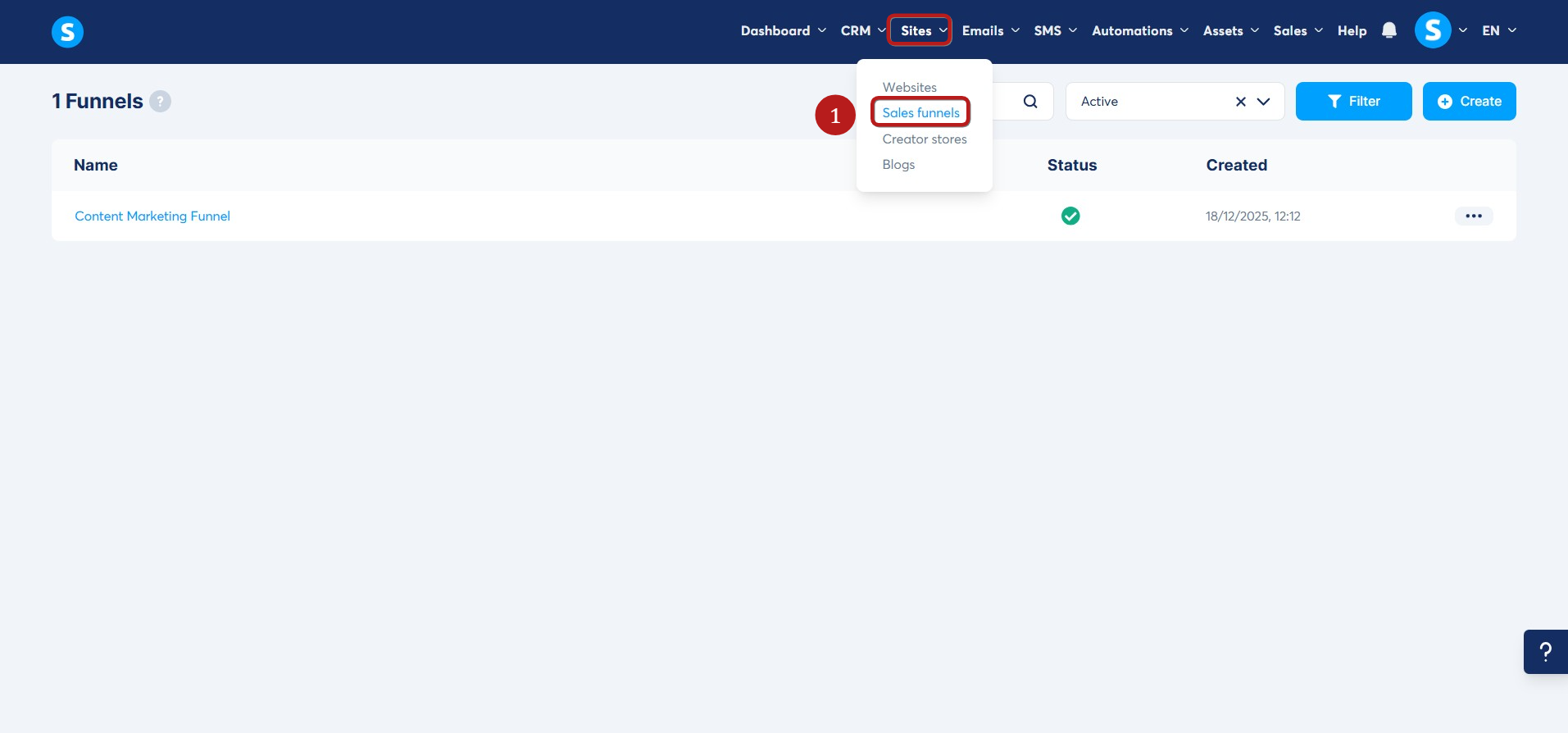Navigate to the Sites tab in the menu, then click Sales funnels (1) to view your list of funnels.