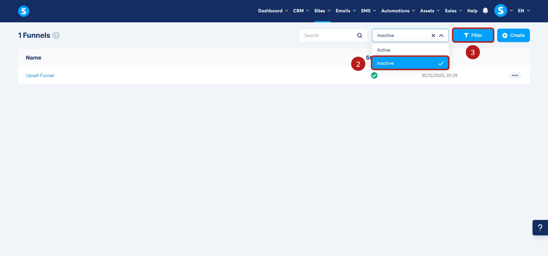 Click the drop-down menu and select Inactive (2) as your search filter. Next, click Filter (3) to view your list of inactive funnels.