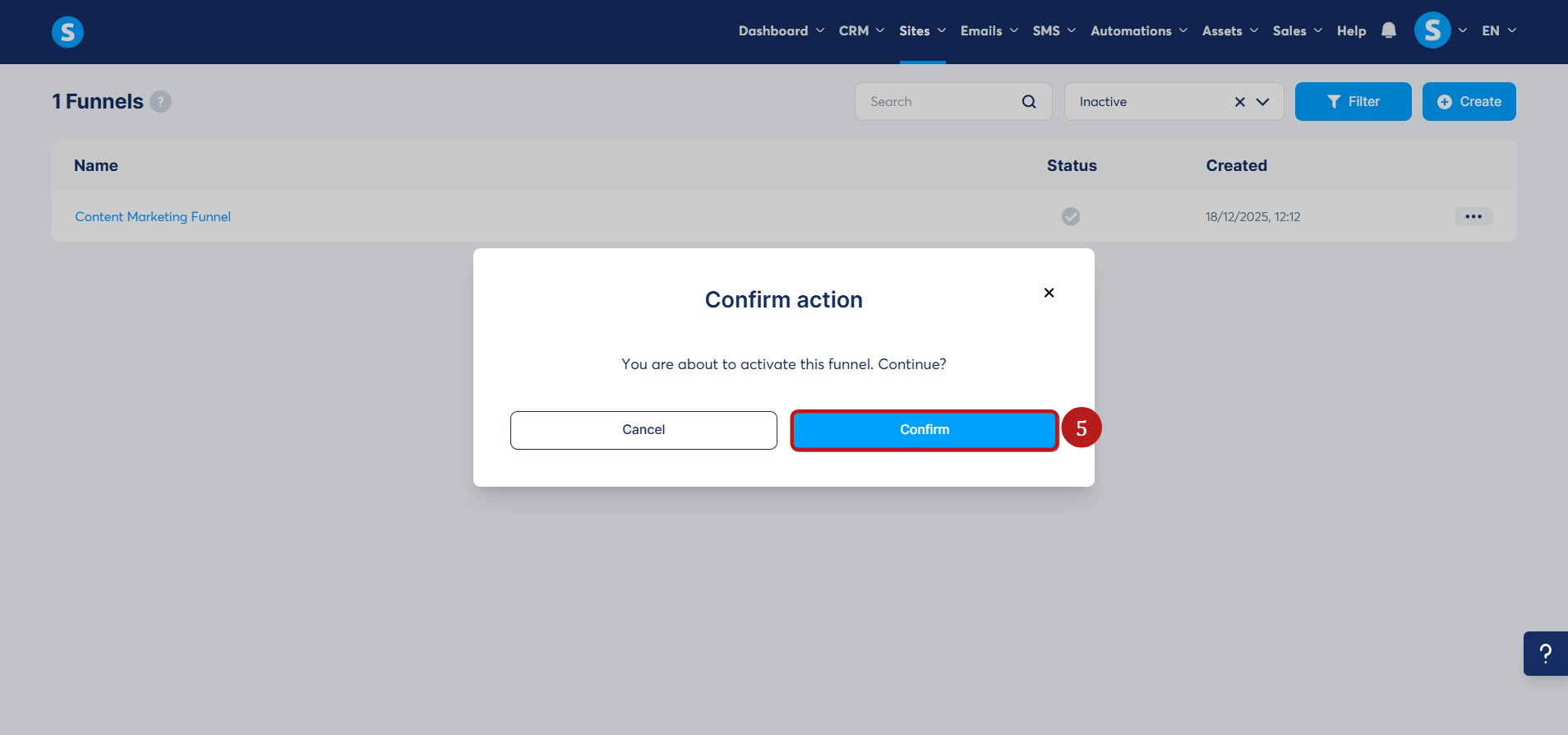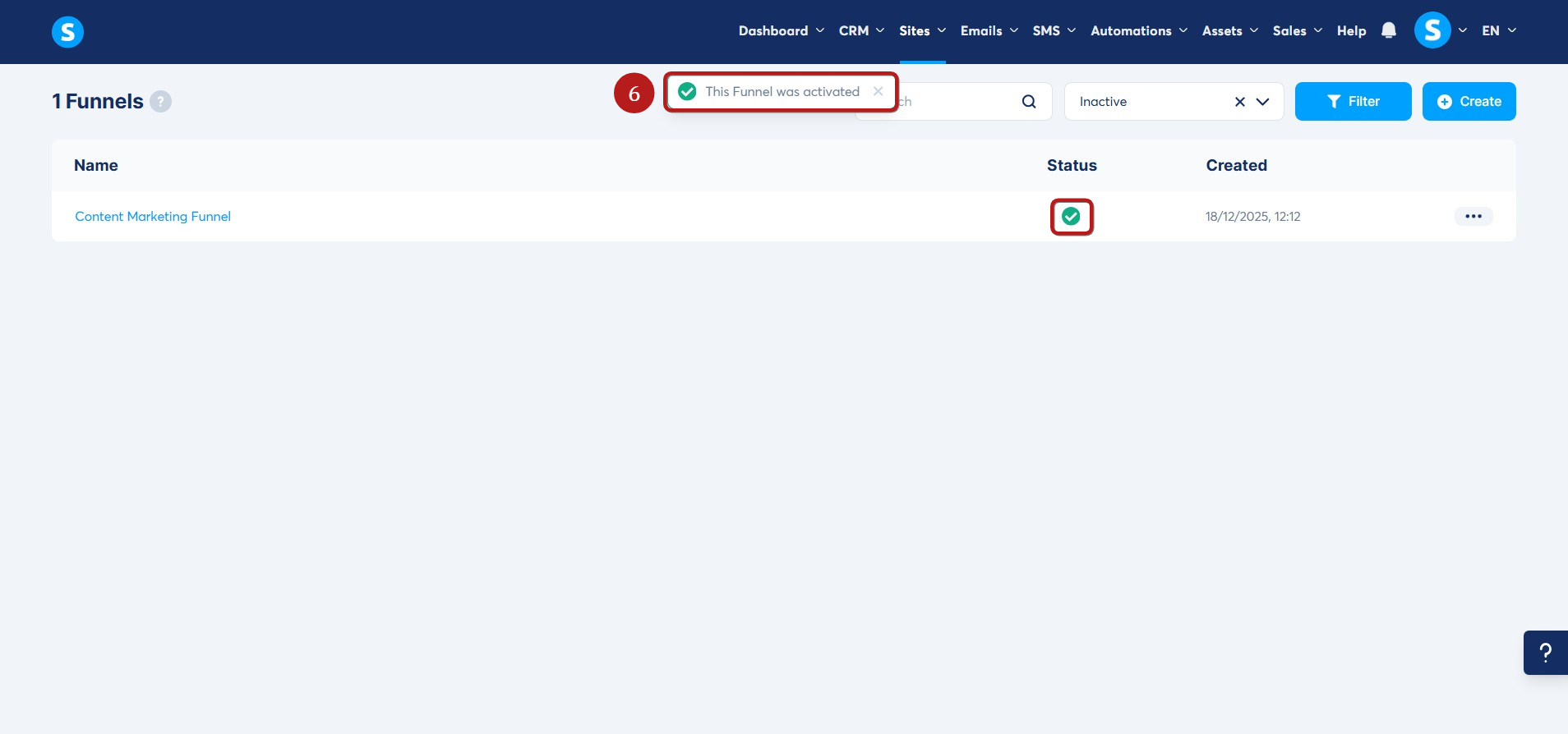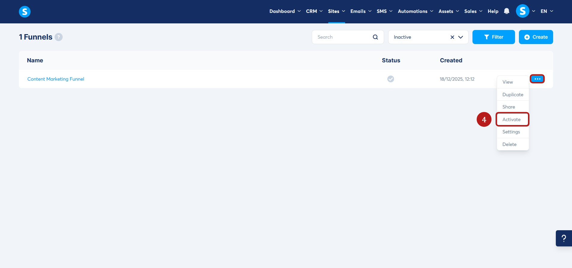Find the funnel you want to activate, click the three dots (...), then select Activate (4).