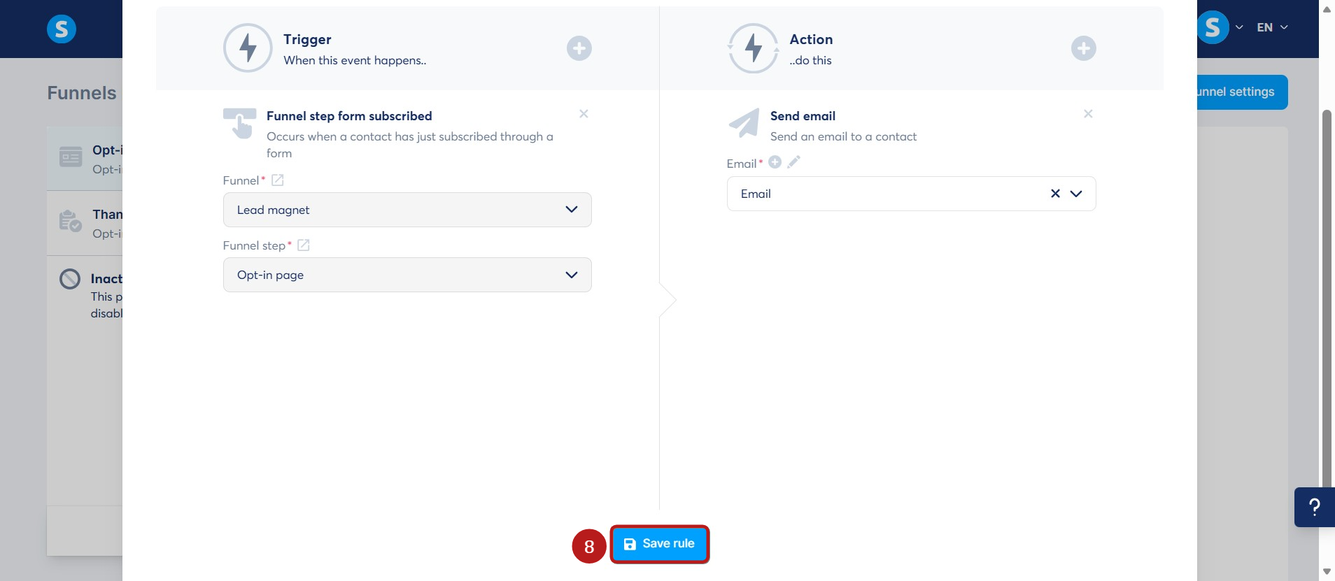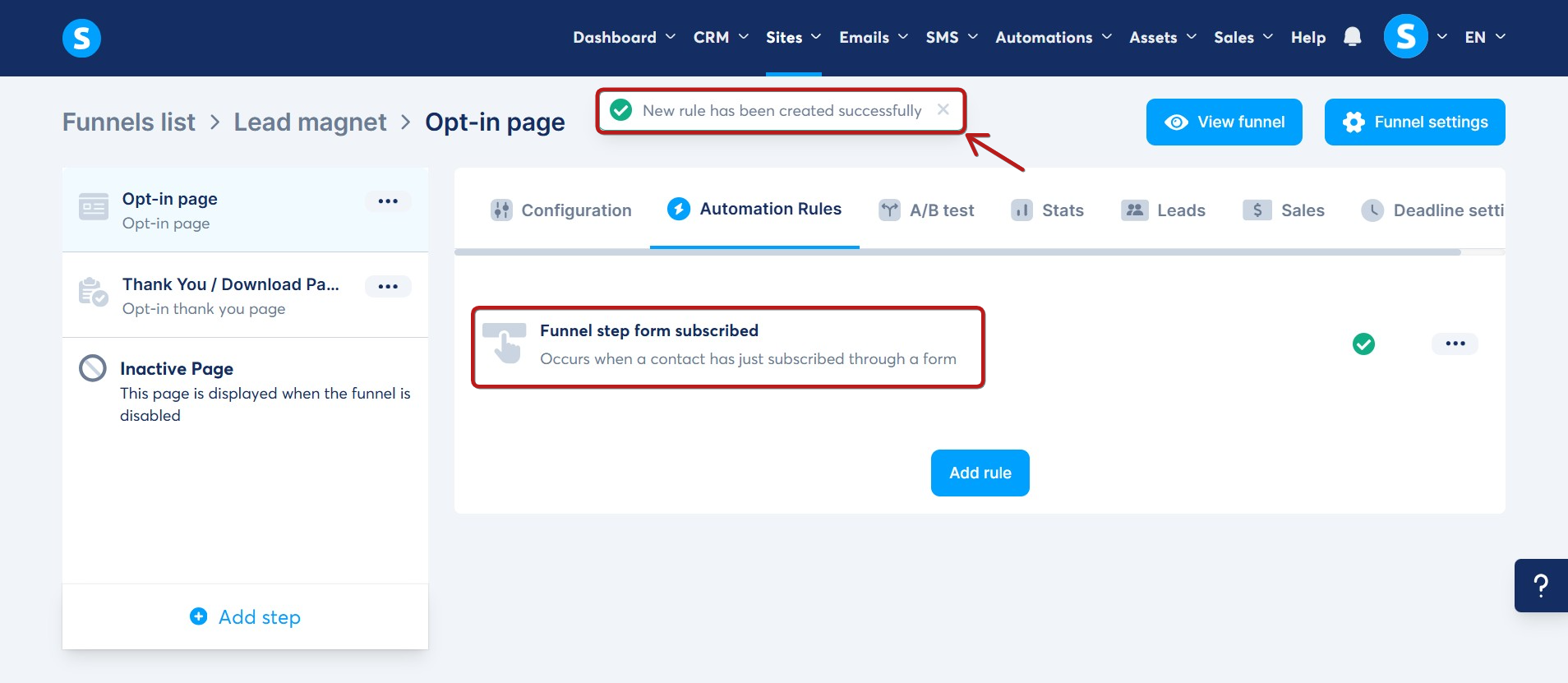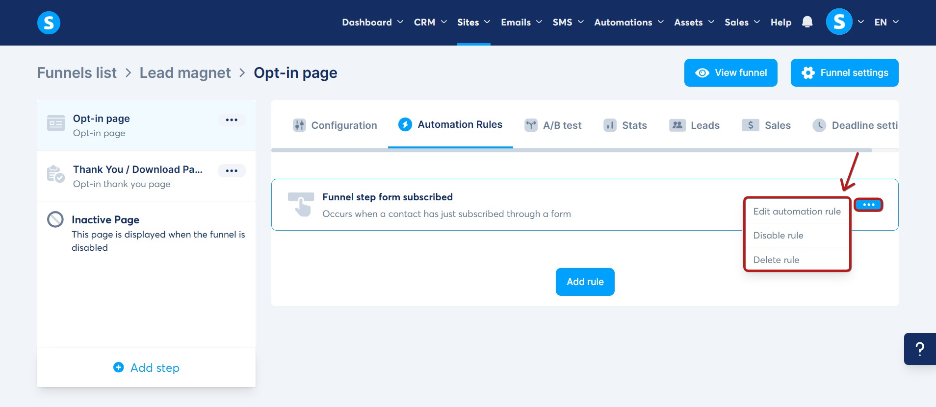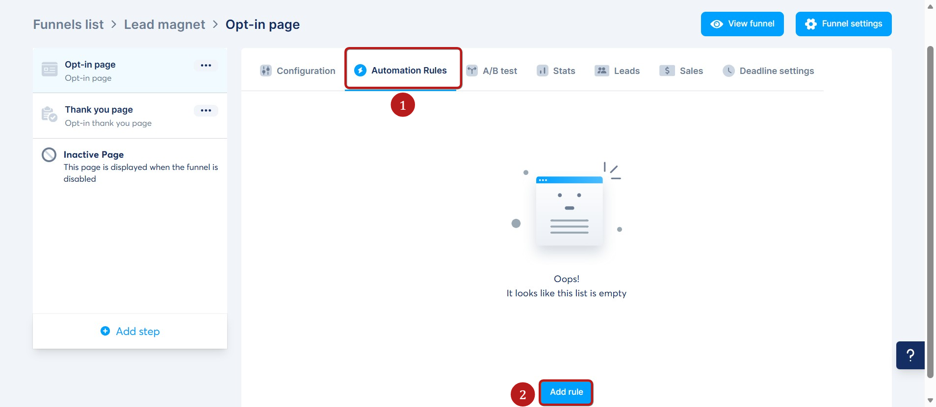 Select your opt-in page from the funnel list on the left. Click on the Automation Rules tab (1), then click Add rule (2).