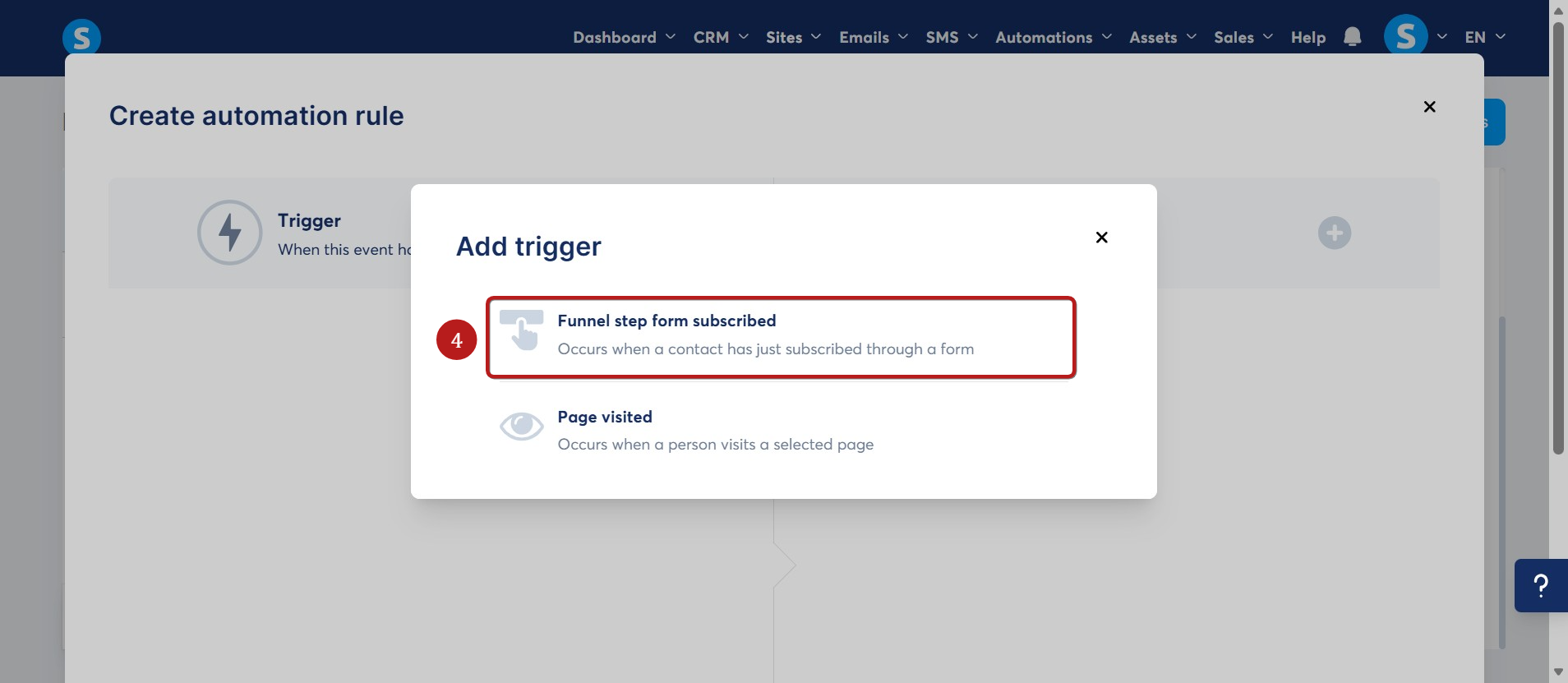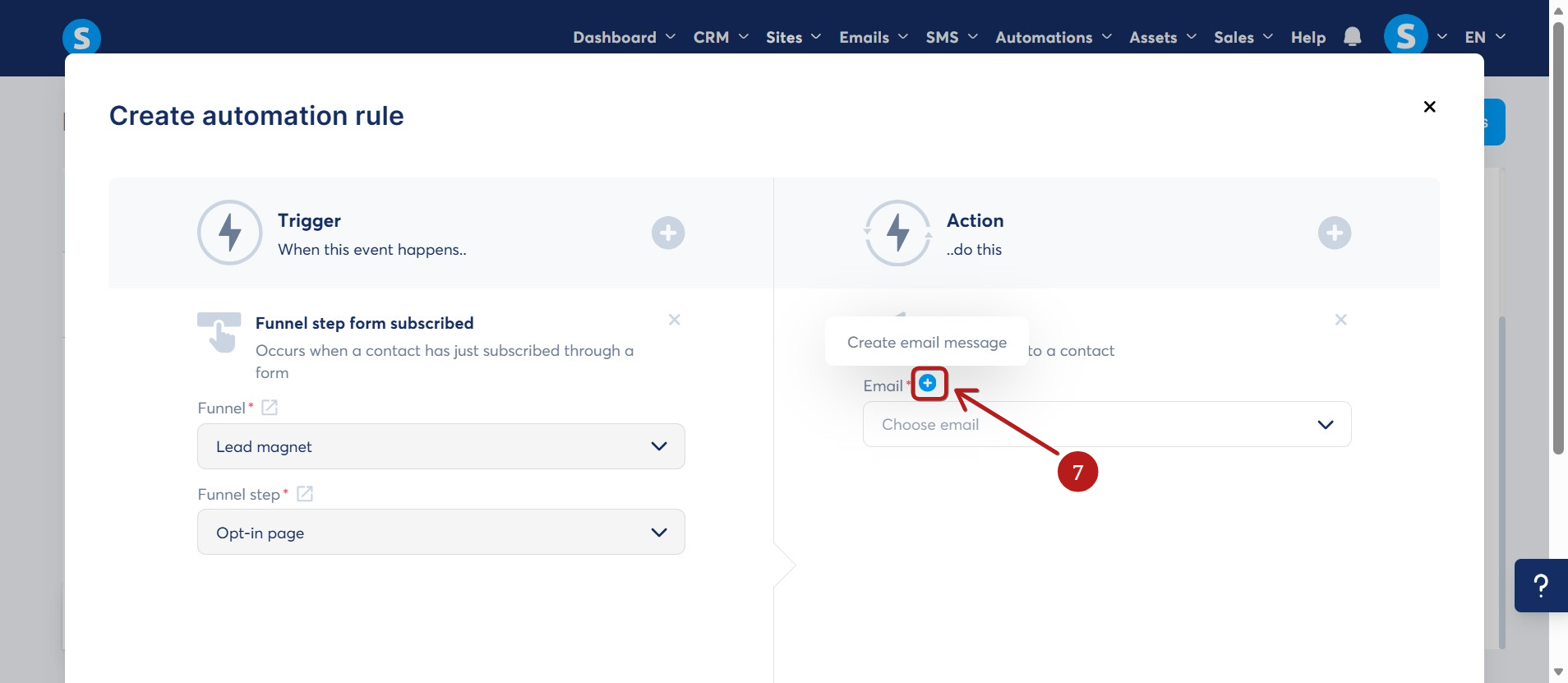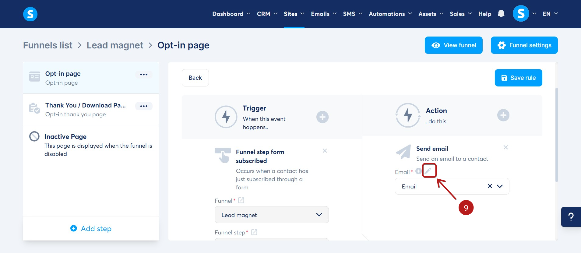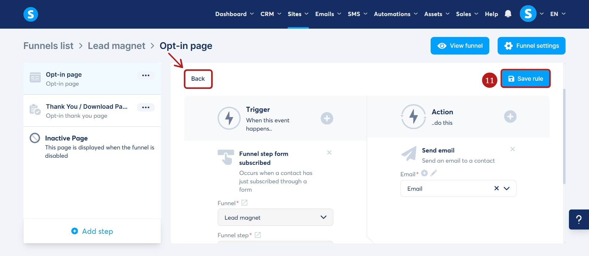 Select your opt-in page from the funnel list on the left. Click on the Automation Rules tab (1), then click Add rule (2).