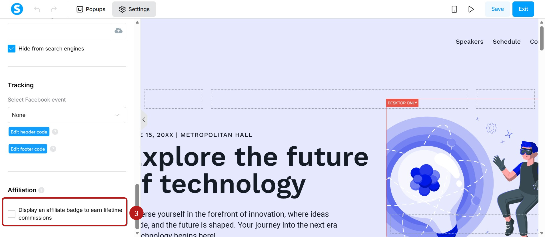 Scroll down the settings menu to the Display an affiliate badge to earn lifetime commissions checkbox (3).