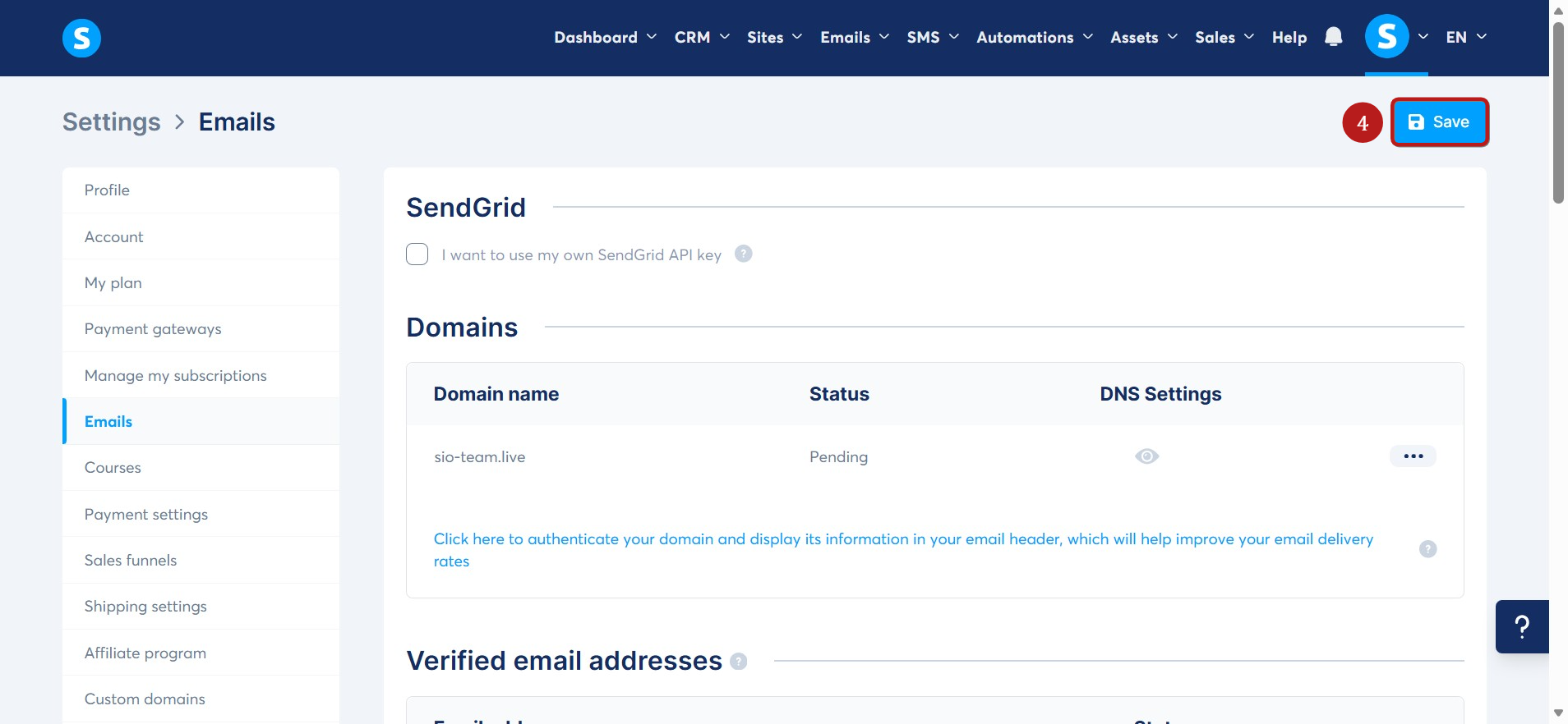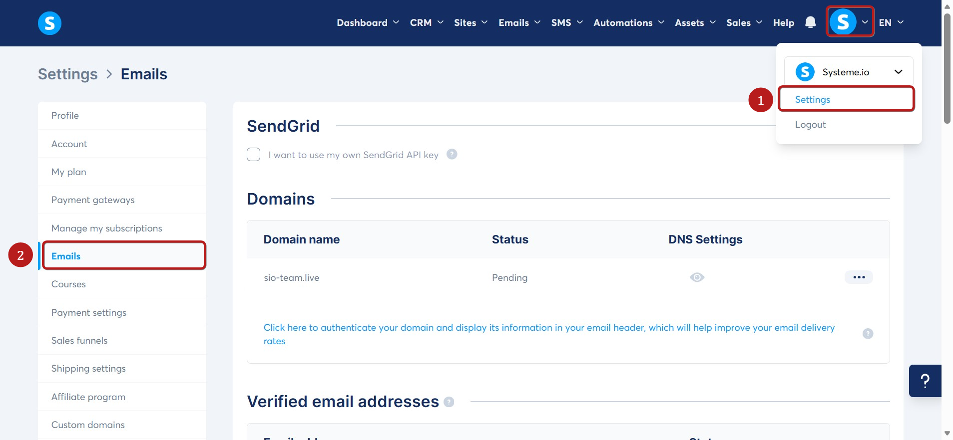 Click your Profile Picture to open the menu. Select Settings (1), then click Emails (2).