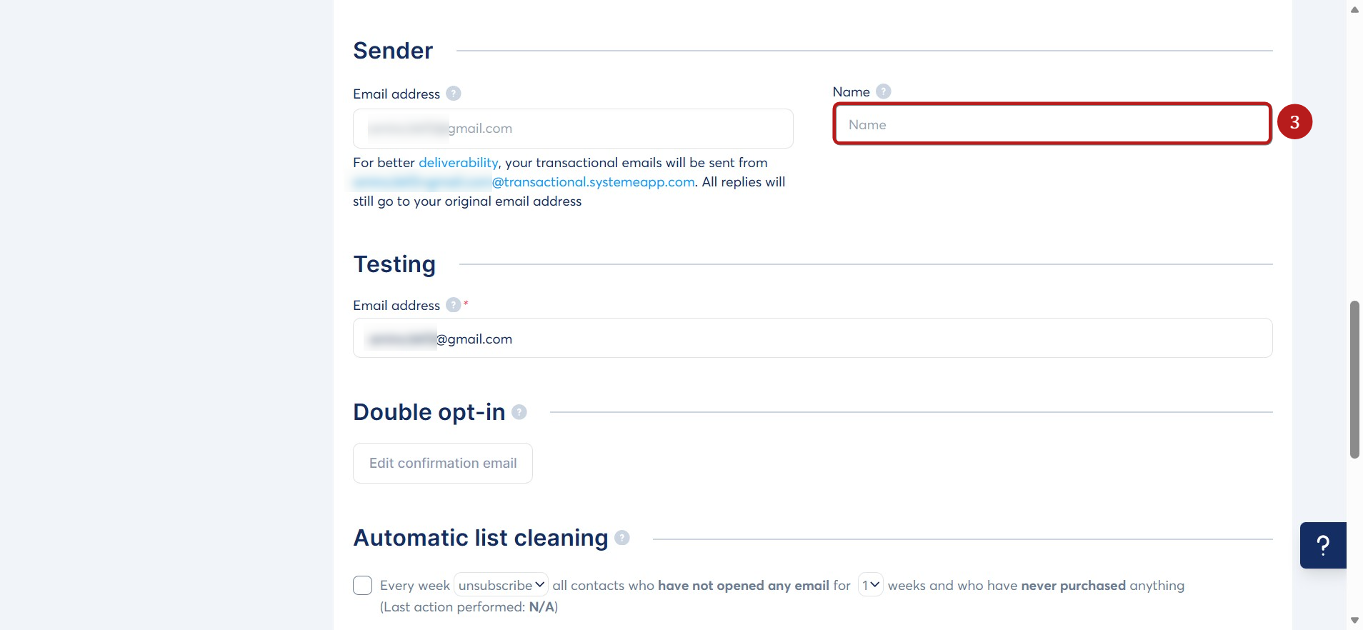 Scroll down to the Sender section and enter the name you want to be displayed for your emails (3).