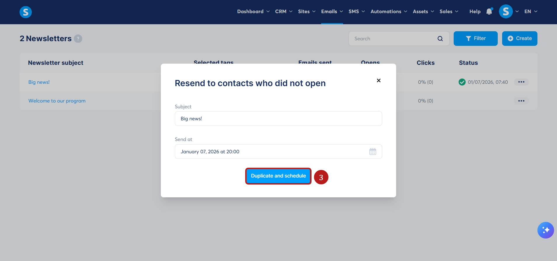 Select the date and time you want the email to be resent, then click Duplicate and schedule (3).