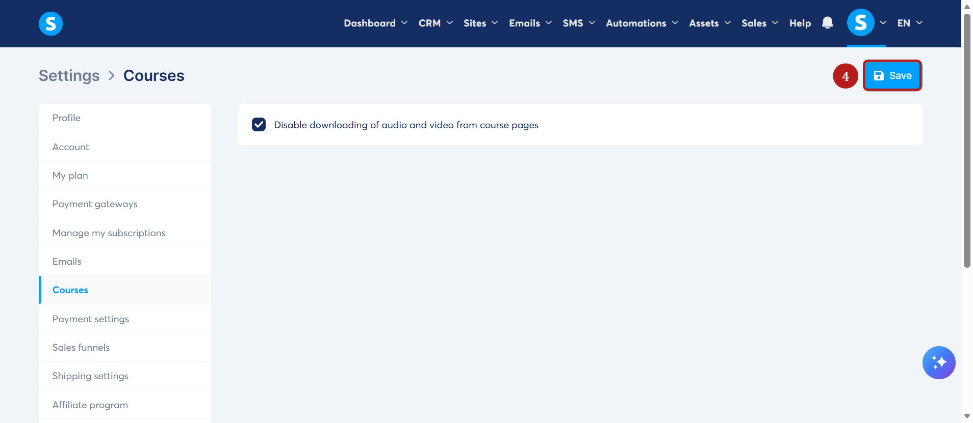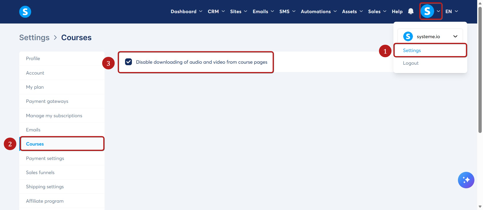 Check the box labeled Disable downloading of audio and video from course pages (3).