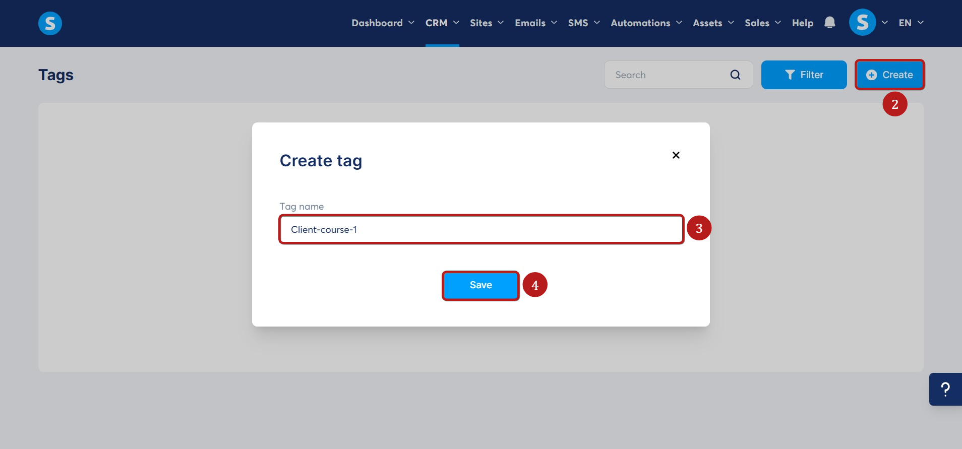 To create a tag, navigate to the CRM tab and click on Tags (1).