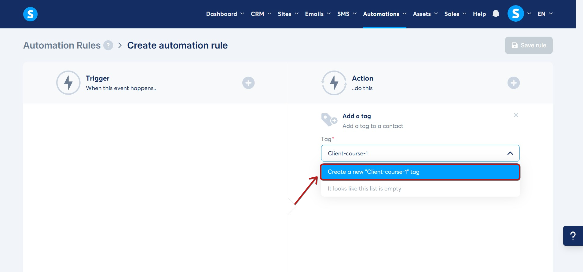You can also create a new tag directly within automation rules. Simply enter the name of the tag you want to create and use in the automation rule, and it will be created automatically.