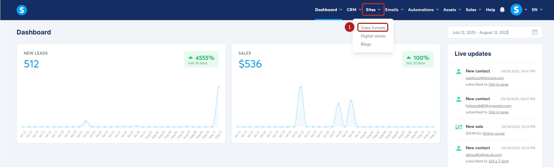 First, go to "Sales funnels" under "Sites" to access your funnels (number 1 in the image).
