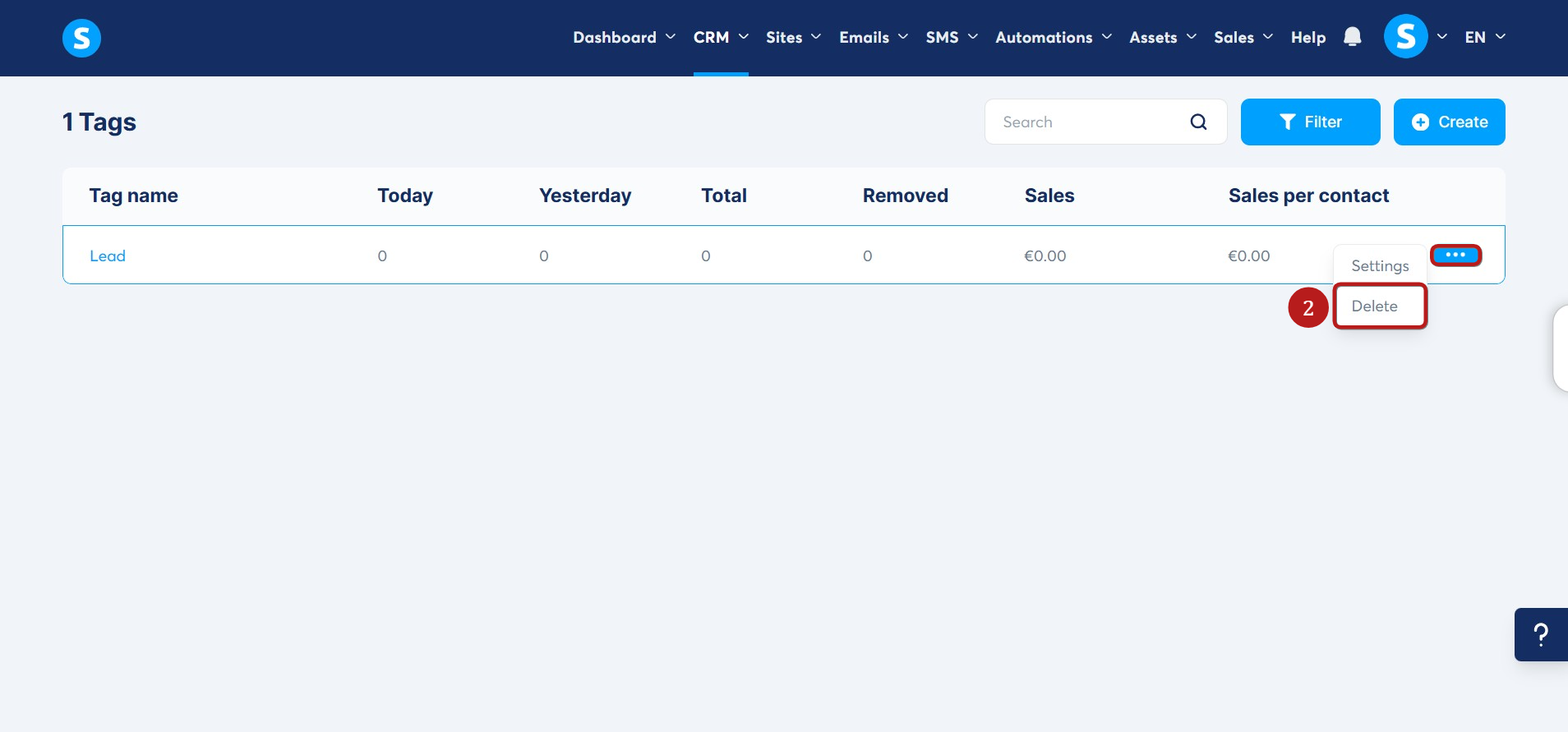 Find the tag you want to delete, hover over the 3 dots (...), and then click on Delete (2).