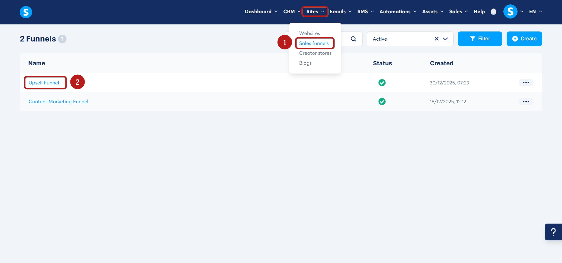 From the menu, navigate to Sites, then click Sales Funnels (1). Next, click the funnel that contains the page you want to share (2).