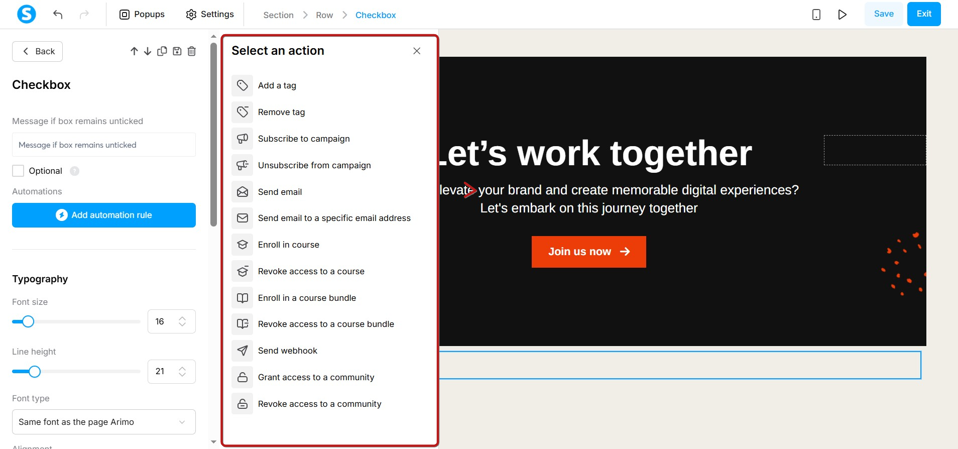 - If a checkbox is marked mandatory and the button action is set to Submit form, users cannot proceed to the next step without checking the box.
